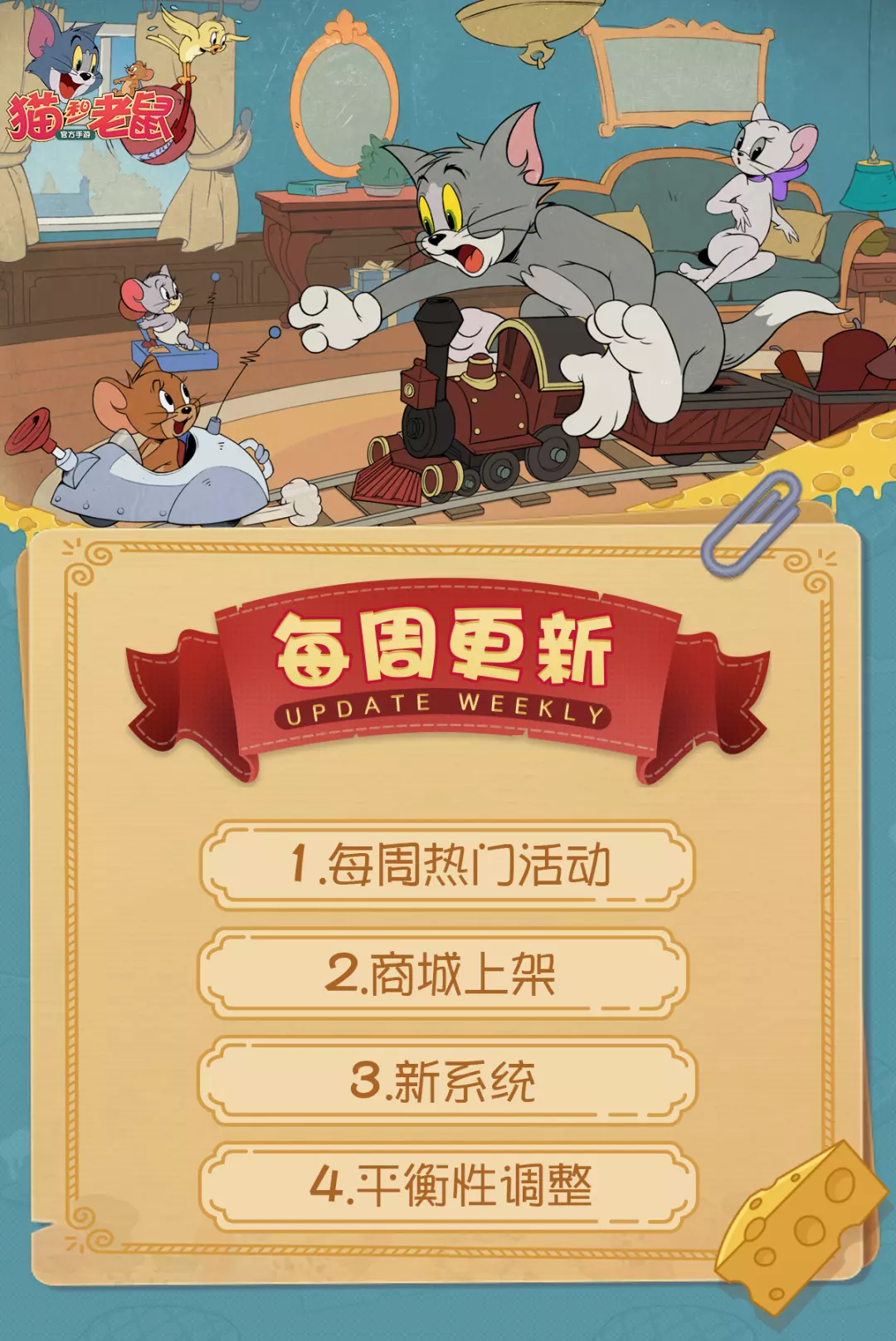 以上就是本周(1月15日)更新维护的全部内容啦!感谢小伙伴们对于《猫和老鼠》手游的支持和喜爱,愿欢乐永远陪伴大家左右!