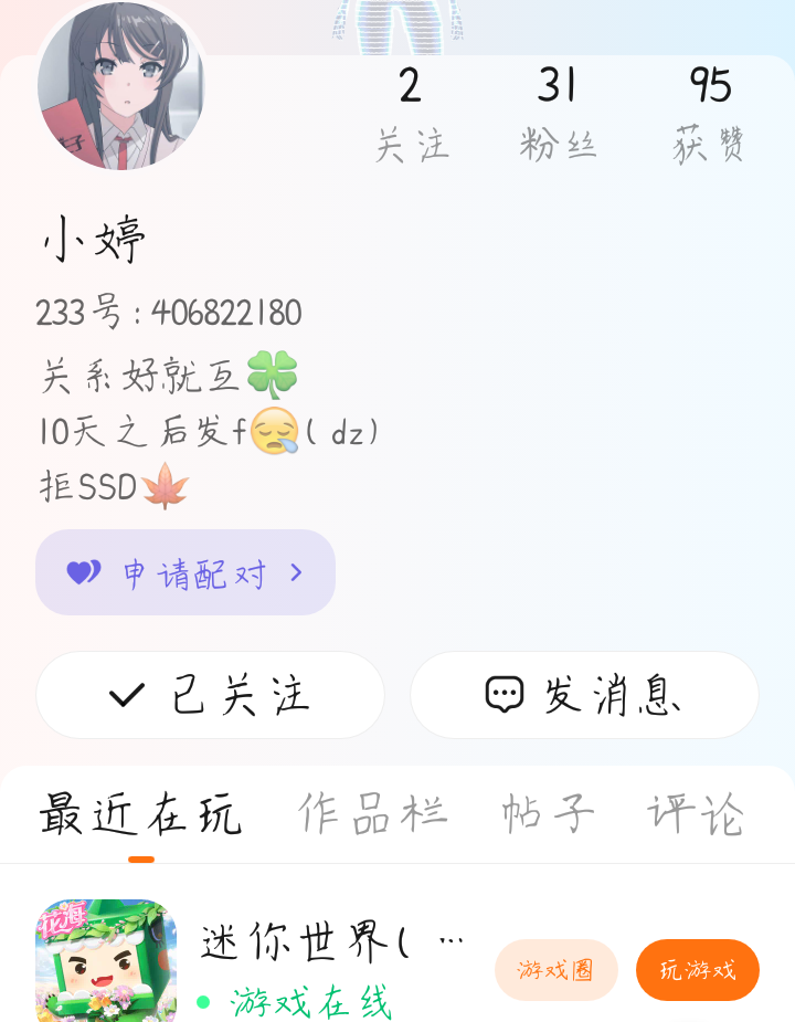 喵喵喵,你是我回归后处的第1个闺蜜,我当时发了一条帖子,然后咱俩就处上了🙈🌹。和你在一起我很开心,每次我进地图你都会来找我,你对我也总是很温柔耐心💞 ,平时咱们也会聊天,虽然你不是很喜欢。