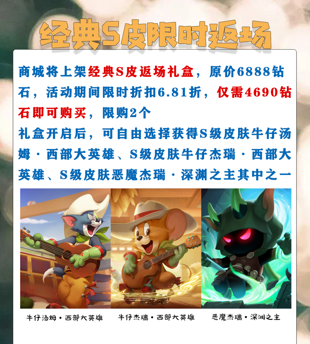 ——礼盒开启后,可自由选择获得S级皮肤牛仔汤姆·西部大英雄、S级皮肤牛仔杰瑞·西部大英雄、S级皮肤恶魔杰瑞·深渊之主其中之一;