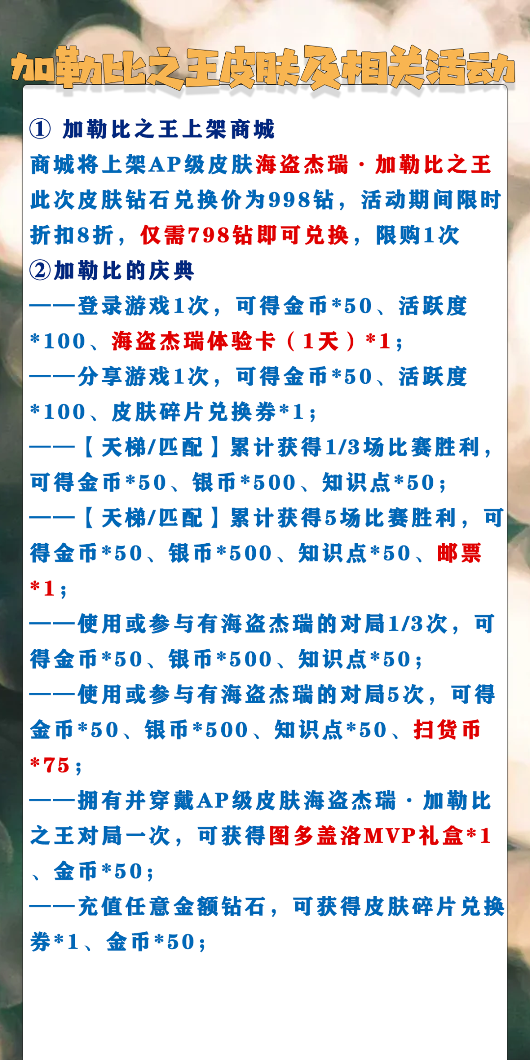 ——本次更新后,商城将上架AP级皮肤海盗杰瑞·加勒比之王~此次皮肤钻石兑换价为998钻,活动期间限时折扣8折,仅需798钻即可兑换,限购1次;
