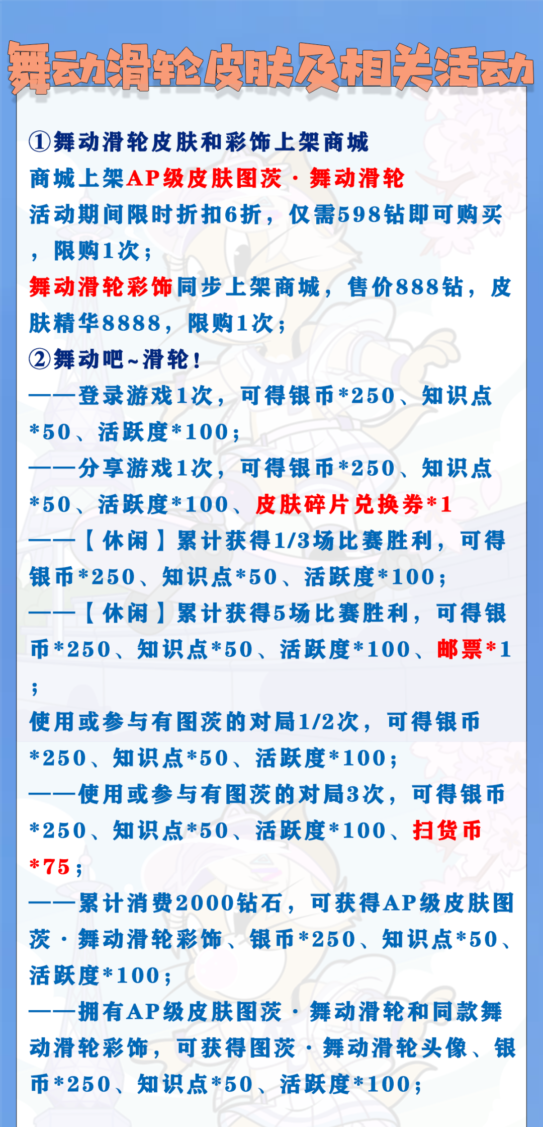——星星*4、邮票*4、皮肤碎片兑换券*1,消耗25元,原价500钻石,累计限购1次;