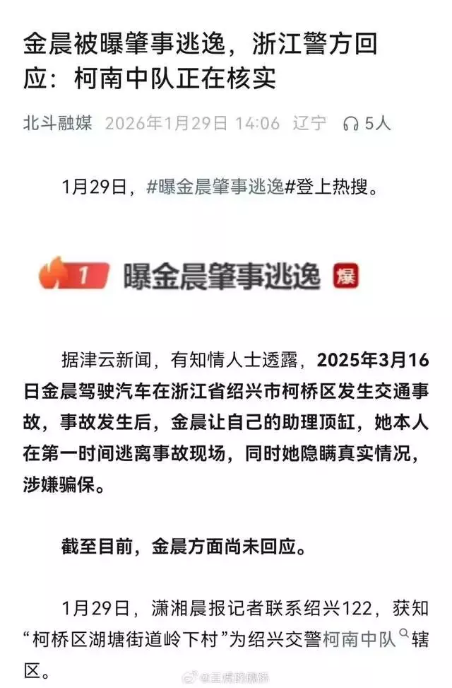 根据大皖新闻等媒体报道,网络上出现“金晨疑似涉嫌交通肇事逃逸”的相关讨论,有所谓知情人士爆料称,2025 年 3 月 16 日,其在浙江绍兴柯桥区发生一起交通事故,事后相关处理方式引发争议。