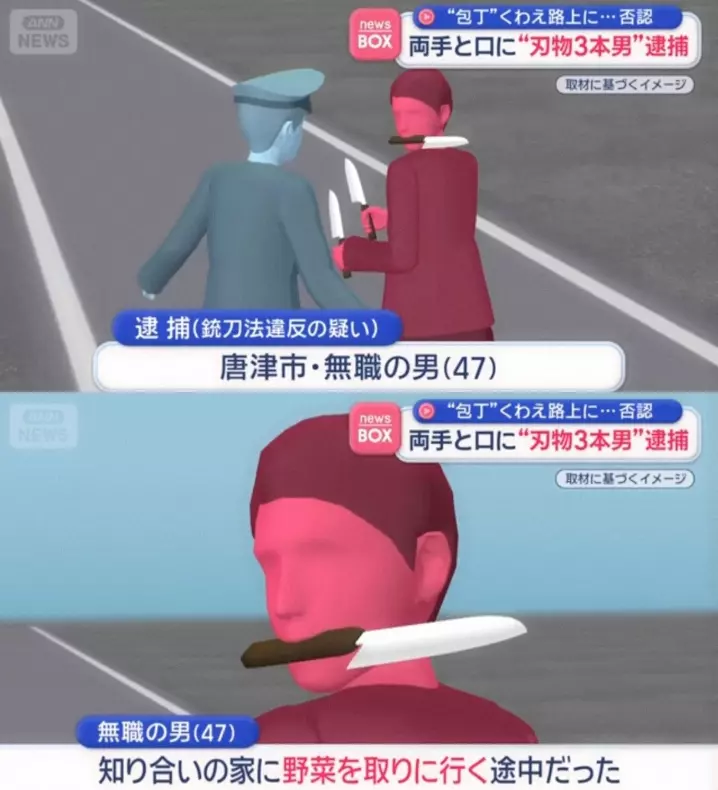 根据警方说明,这名男子因涉嫌违反日本的《刀剑类管制法》,被当场逮捕。