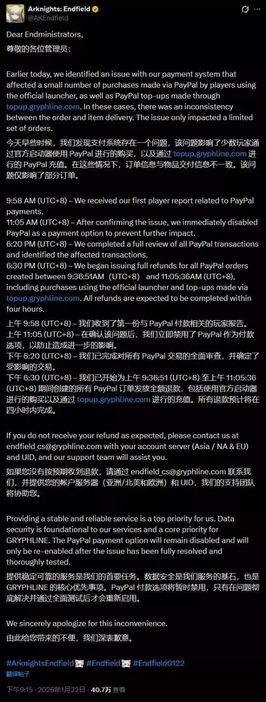 昨晚,鹰角官方在海外社交平台发布道歉公告,内容包括:确认 PayPal 支付存在异常,第一时间关闭 PayPal 支付通道,已锁定受影响订单,将对相关 PayPal 订单进行 全额退款,退款预计在 4 小时内完成