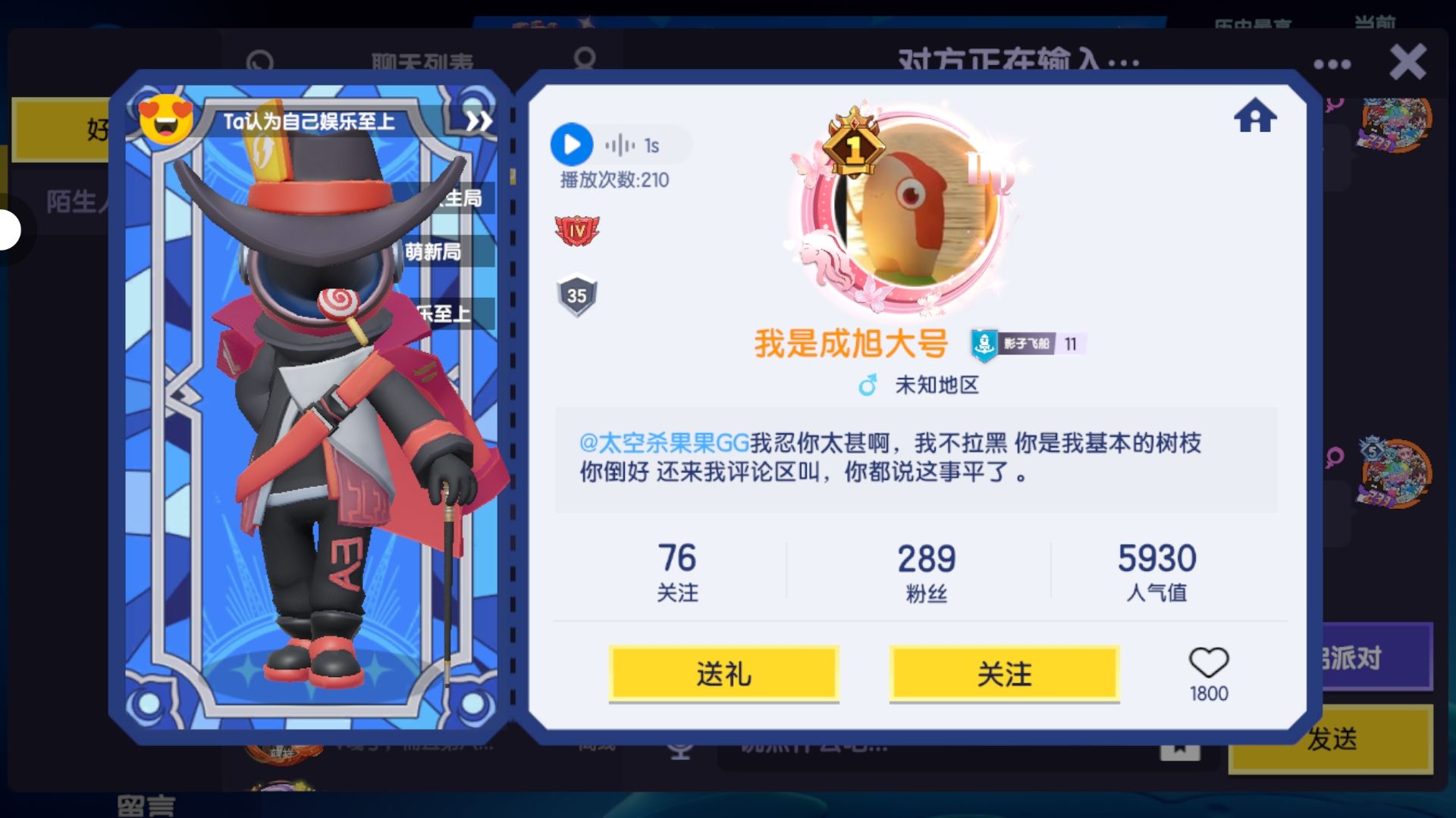 真的离谱啊,我刀一个人那人就直接开地图邀请我,因为我闲着没事嘛,我就进去了,然后他一上来就直接嘲讽我了,就说什么就你刀我是吧之类的话,然后呢,就发语音就是那种语音包里面的内容就是小孩哥在骂人嘛,要不是我是受害者,我还真信了他的鬼话