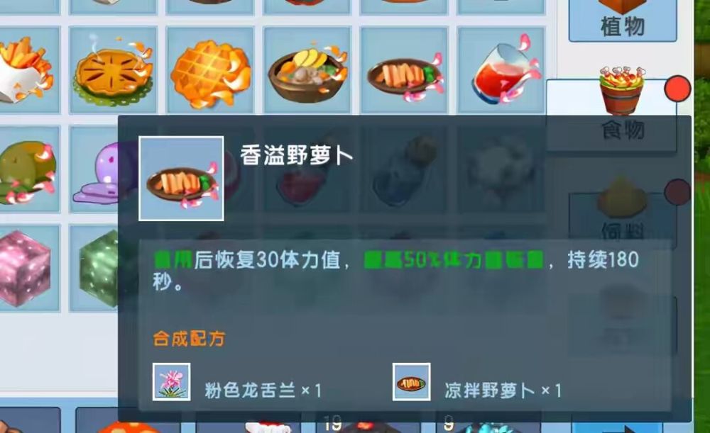 这个食物食用后会立刻恢复30体力值,提升百分之50的体力恢复速度,持续时间180秒,老蛋觉得,这个也是有用处的,但是并没有香溢蔬菜煲来的直接,不过大家也可以准备一些,以备不时之需