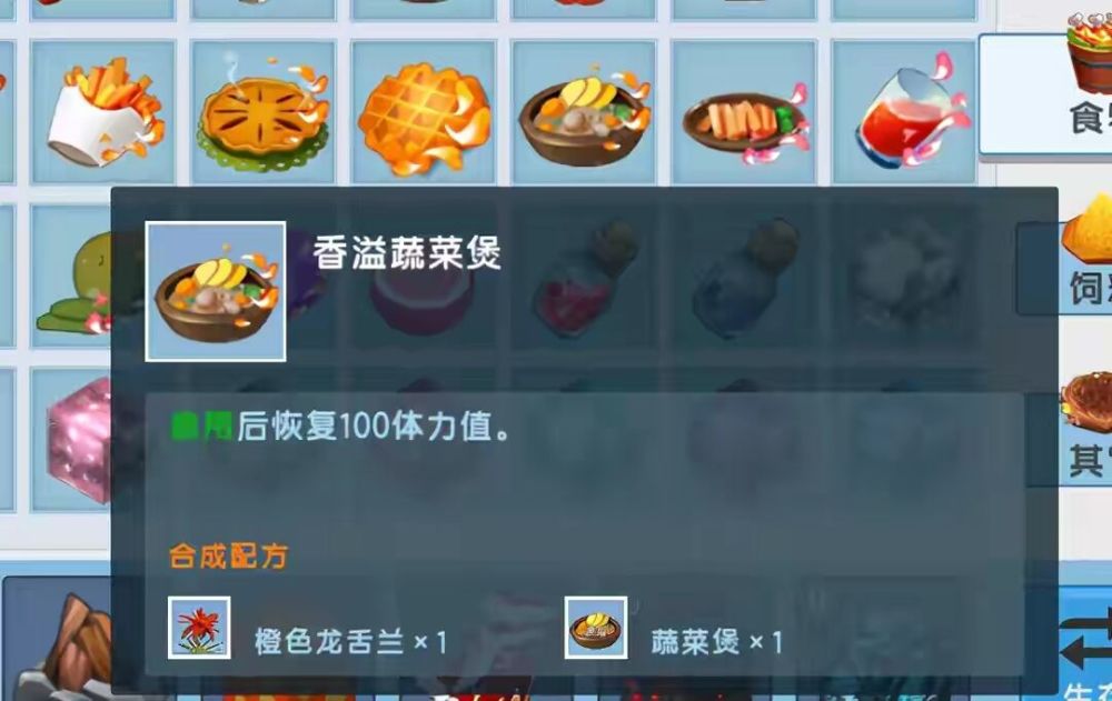 香溢蔬菜煲,这个食物我个人认为,是比较重要的食物。食用后直接回复100体力值。因为新版本里面,体力值是可以提升上限的,换句话来说玩家们不仅只能有100体力值。所以这个时候,一次恢复100体力值,就很香。所以建议小伙伴们,多制作些香溢蔬菜煲。不过香溢蔬菜煲制作起来,并不容易。小伙伴们需要在农场上多下功夫了,这样才能大量制作