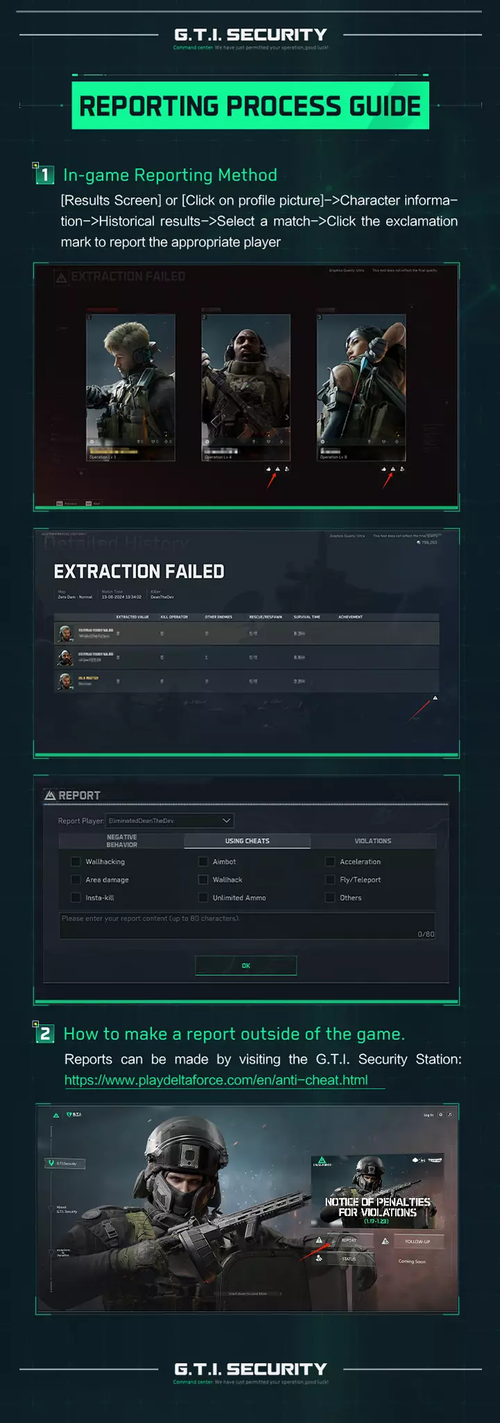 各位玩家, 三角洲特种部队安全团队致力于维护公平的游戏体验,将对任何被发现作弊或违反服务条款的玩家采取相应限制措施。 作为开发者,我们深知为三角洲特种部队玩家营造安全有趣环境的重要性。因此,我们对任何违反游戏规则的行为采取零容忍政策。这包括但不限于使用插件、非法软件、不当行为、恶意利用漏洞或BUG等。一旦发现此类行为,我们将立即展开调查并采取相应行动,包括但不限于永久封禁账号、IP封禁以及游戏内外通知等。同时,我们也邀请玩家通过举报渠道以及社区积极举报游戏内的不当行为,以维护公平健康的游戏环境。 重要通知: 各位玩家, 为提升游戏的安全体验,G.T.I.安全团队经慎重考虑,决定扩大作弊击杀补偿的覆盖范围: 此前,仅受被处以10年封禁的作弊者影响的玩家有资格获得作弊击杀补偿。现在,受被处以30天封禁的作弊者影响的玩家也可获得作弊击杀补偿。当封禁者收到确认30天或10年封禁成功的邮件后,作弊者击杀补偿将在该邮件发送后的3个工作日内通过游戏内邮件发放。请及时查收邮件。 注意:若带入比赛的装备已由队友带出并归还给你,则不会再次发放该击杀补偿。 PC端: 本周(2026年2月23日至2026年3月1日),封禁行动针对2954名用户实施10年封禁,其中包括642次DMA封禁/实时拦截/冻结操作。此外,18087台设备被封禁一年,6575次作弊尝试被实时阻止,631名作弊玩家被强制下线,188名与作弊者组队的玩家被发出警告。此外,还包括43起封禁案例,同时没收了非法获取的收益。 移动端: 749名玩家被处以10年封禁,实时阻止了13039次作弊尝试。 经济安全违规 enforcement行动: 我们持续打击通过第三方低价充值、盗号转移、欺诈性卡费以及其他非官方折扣充值方案(包括但不限于直接货币充值、通过在市场上高价出售 cosmetics 以获取【Delta Tickets】的RMT交易等)来非法获取【Delta Coins】/【Delta Tickets】的行为。上周共处理7起案例,所有通过这些方式非法获取的【Delta Coins】/【Delta Tickets】均已被没收。我们进一步打击了自动化脚本的使用,涵盖“批量自动注册账号”“多客户端自动登录”“自动刷取(速通)”“自动提取”以及“自动出售物资”等行为。仅上周就处理了9129起相关事件,其中包括4185起没收违规收益案例和4944起账号封禁案例。 我们在此确认,将继续对所有违规账号采取实时处理措施。请所有玩家遵守游戏规则,共同维护健康公平的游戏环境! 以下是本次部分处理账号的名单(排名不分先后)。