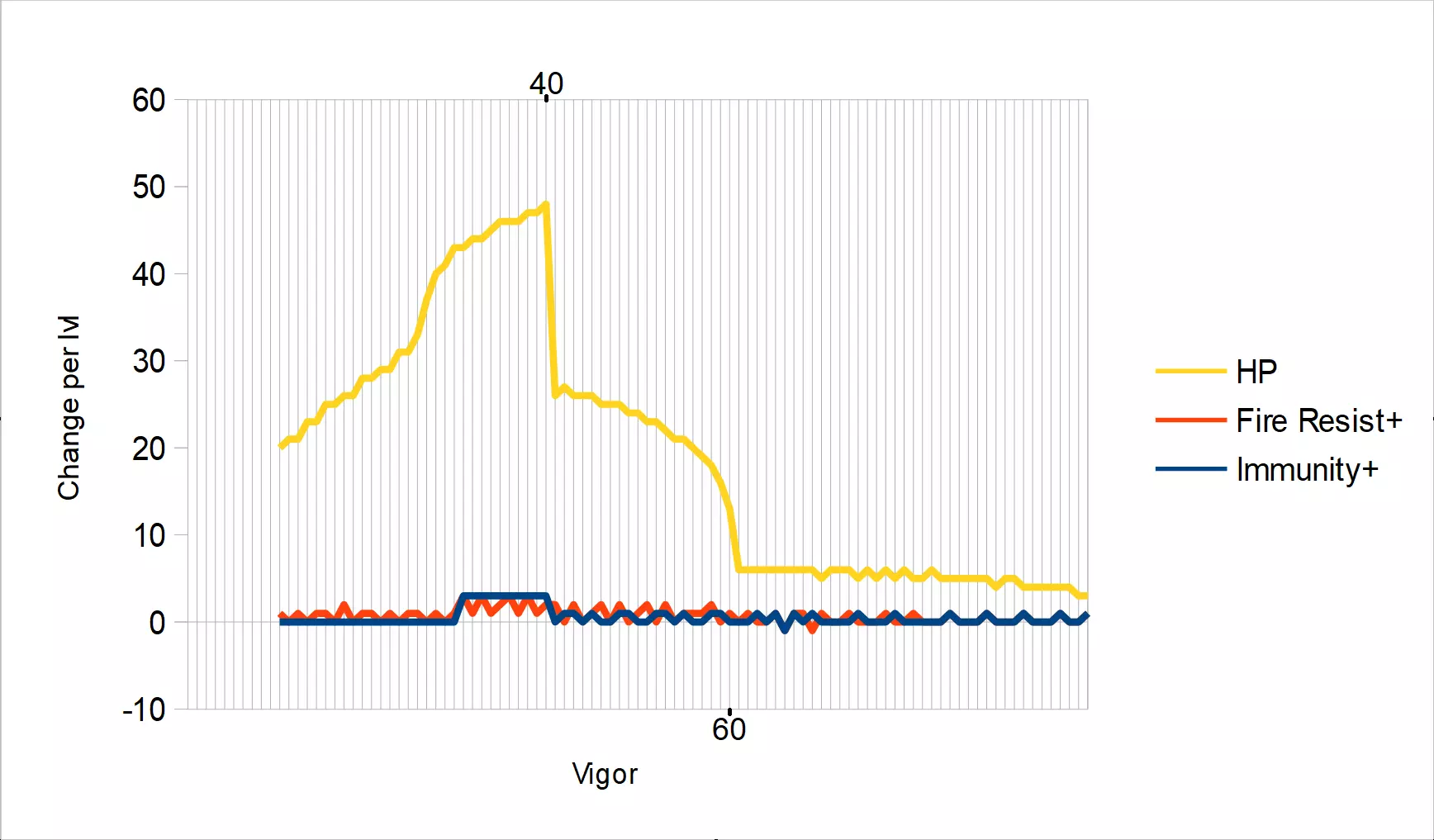 活力 = 40/58 “该属性决定生命值——你的生命。若生命值归0,你将死亡。 同时影响火焰抗性和免疫力——你对各种毒素和腐败的抵抗力。” 40点后收益大幅下降,从58点提升至60点几乎无收益 建议:由于生命值在40点前增长显著,建议至少将活力加到40点,但无需加到58点