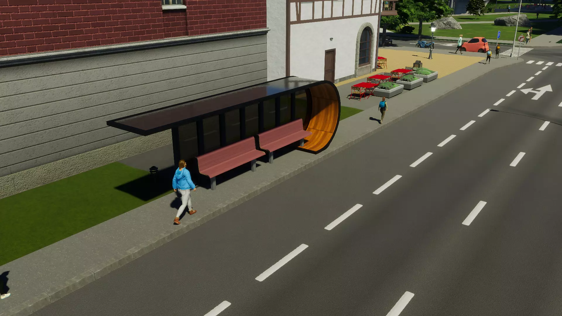 紧凑型翻新电车车库 建筑风格电车站棚 与新公交站道具类似,这款电车站道具可为候车乘客提供一个外观现代且舒适度略高的候车棚,乘客可使用内置座椅。 无论是放置在人行道还是道路中央分隔带上,该车站都能作为道路布局的一部分进行适配。分隔带上可并排安装两个候车棚,以服务双向客流。