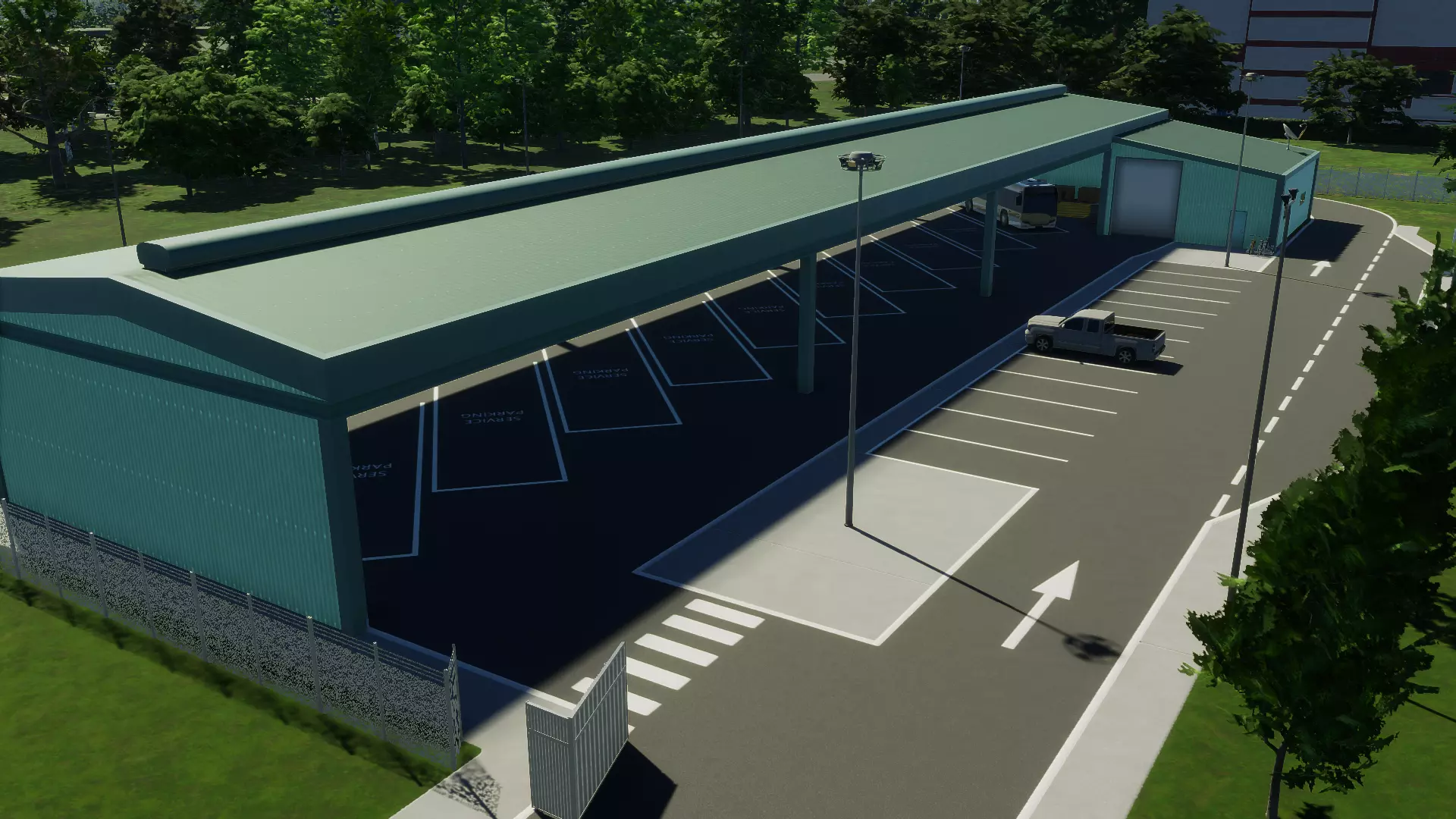 小型城市公交站 大型城市公交站 大型城市公交站的功能与其小型版本类似。它占地面积更大,可容纳更多公交站台。每个站台都设有驶入式停车区,以便其他公交车能够绕过已停靠载客的车辆。 该公交站有两项可用升级——额外站台和地下地铁接口。 站台顶部采用两种交替设计,中央广场和大厅的主屋顶以及地铁接口也同样如此。 市民可以在出发前在此休闲,因为该车站同时也充当周边区域的公园。他们还可以将车站用作小型公共停车场,用于停车换乘或前往附近场所。