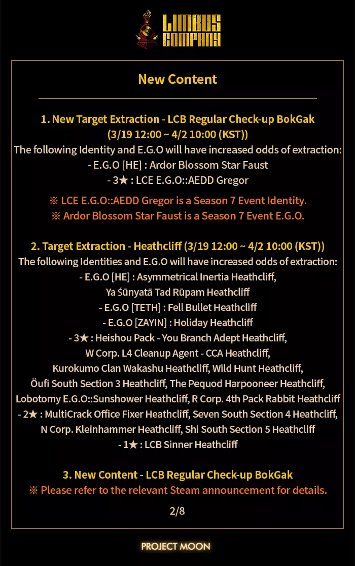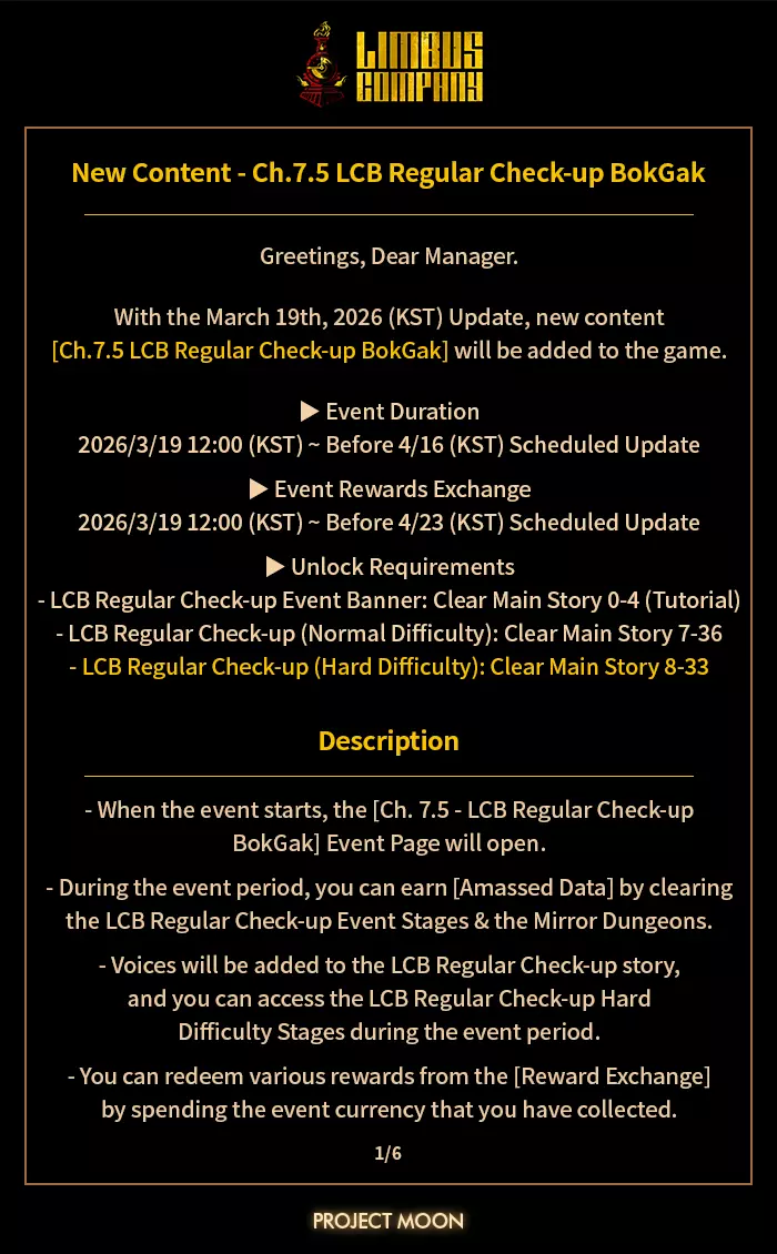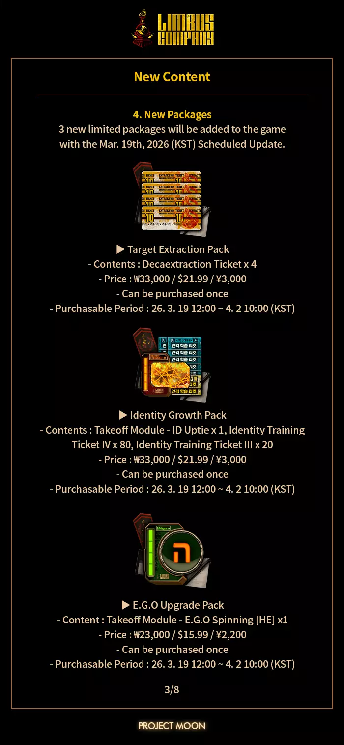 《边狱公司》3月19日更新补充内容 [3月19日定期更新新增内容] 1. 丹特笔记新增条目 3月19日(韩国时间)定期更新后,丹特笔记将新增条目。 解锁条件:通关主线剧情第8.5章所有关卡。 2. E.G.O礼物【万恶终结】合成配方变更 - 变更前:强制重量+鲸之心+镇港鱼叉 - 变更后:鲸之心+镇港鱼叉 ※融合这些E.G.O【已知问题】O Gifts组合导致玩家无法再获得E.G.O礼物【Imposed Weight】的效果。此外,我们发现与其他融合礼物相比,融合【The End of all Evil】的E.G.O礼物配方相对稀有,融合难度和成本更高,而带来的收益却较低。 考虑到这一点,我们将通过从其配方中移除E.G.O礼物【Imposed Weight】来降低该E.G.O礼物的融合难度和成本。 【3月19日定期更新已知问题】 ▶ 新的目标抽取【LCB Regular Check-up BokGak】卡池存在抽取结束日期不正确的问题 ※ 请注意,该抽取的实际结束日期如之前所公布,为2026年4月2日10:00(韩国时间)。 ※ 此问题将在今日通过热修复解决。《Limbus Company》更新内容 1. 修复【瓦尔普吉斯之夜4】与【瓦尔普吉斯之夜5】迷你剧情未添加语音的问题 ※ 该问题将在3月26日的定期更新中修复 对于更新内容缺失及已知问题带来的不便,我们深表歉意。