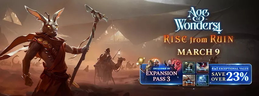新法典: 战团法典:组建强大的军事部队,并指导你的单位晋升。 沙行者法典:扩张沙漠,潜行并致盲敌人,召唤沙漠守护者为你提供保护。 军阀法典:率领强大的战士与地狱盟友征服世界。 新增野生动物与单位。面对在领域中游荡的强大新型野生动物: 6种灾变后幸存、变得面目全非的破碎生物。 2种沙漠动物:小心致命的沙蝎与沙虫。 额外内容: 5个新领域特性与2个新领域模板。 2种新坐骑:骆驼与蝎子。 3首由作曲家Michiel van den Bos创作的新音乐曲目。 全新界面皮肤,带来完全沉浸式的美学体验。 以及更多内容!免费蝎子更新 除了《从废墟中崛起》外,所有《奇迹时代4》玩家都将在3月9日收到免费的蝎子更新。 蝎子更新引入了多项战斗更新,包括移动速度、经验值获取、防御和抗性的调整。此外,还为统治者自定义添加了颜色选择器,为万神殿新增了物品。 更多信息将在后续的开发者日志和开发者直播中公布,完整细节将在更新发布前不久的补丁说明中提供。 废墟之外:枯萎世界中的等待——抢先看! 欢迎参加我们本周四(2月12日)欧洲中部时间下午2点的直播,我们将深入探讨《从废墟中崛起》,并展示枯萎世界中的等待。直播结束后,我们的首篇开发者日志将深入探讨新内容,在游戏发售前每周都会发布新的开发者日志。观看《浴火重生》抢先体验开发者直播!