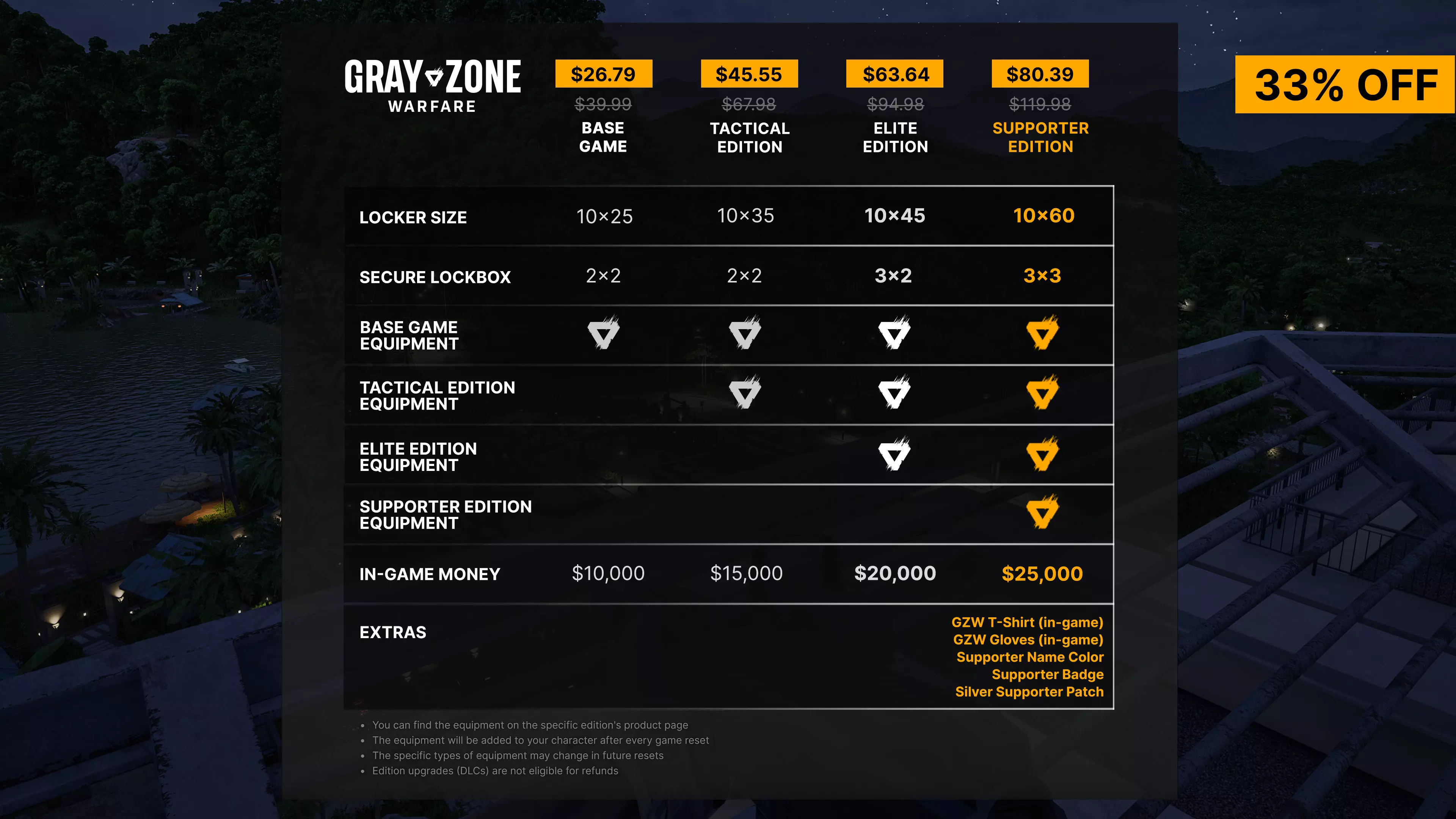 大家好, 如果你一直在考虑入手《灰色地带战争》或升级你的游戏版本,现在正是绝佳时机。为庆祝“矛头”更新即将上线,从3月26日上午10点(太平洋时间)/下午1点(东部时间)到4月9日上午10点(太平洋时间)/下午1点(东部时间),基础游戏及所有版本均享受33%的折扣优惠。 “矛头”更新将于3月31日正式推出,而支持者版的拥有者可从3月27日开始提前体验。