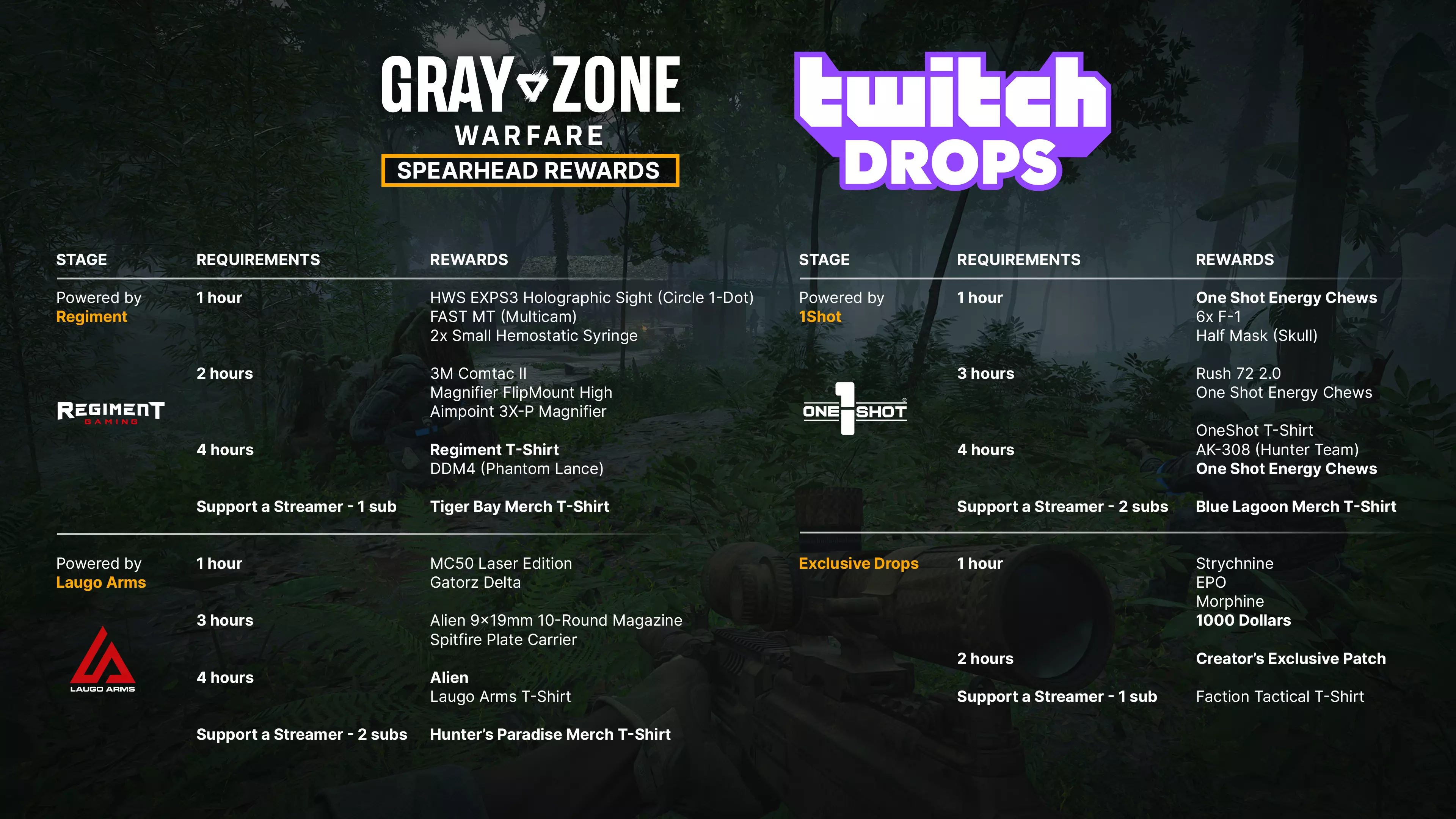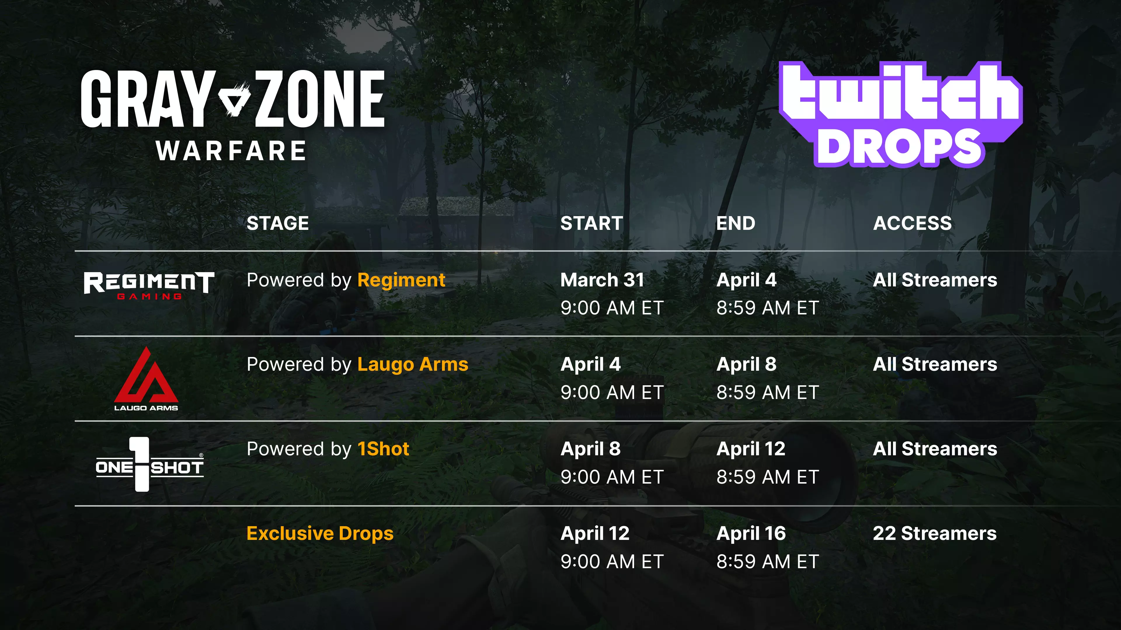 什么是Twitch掉落奖励以及如何获取? Twitch掉落奖励是指你通过在Twitch上观看创作者直播《灰色地带战争》来获得独家游戏内奖励。获取奖励的方法如下: 观看启用掉落奖励的直播 在Twitch上搜索【DropsEnabled】标签。大多数主播也会在直播标题中提及掉落奖励。 关联你的账户(如果尚未关联) 将你的Steam账户与Twitch账户进行关联。 追踪你的进度 你可以在Twitch账户中监控每个活动的进度。点击你的个人资料图片,然后进入【掉落与奖励】分类。 什么是支持主播计划?支持主播功能与Twitch掉落机制类似,但并非仅通过观看《灰色地带战争》直播来获取奖励,而是需要在主播的直播间订阅创作者或赠送订阅来获得奖励。这为你提供了一种支持参与该活动的喜爱创作者的方式,同时还能在游戏中获得有价值的物品。 注意:Prime订阅不计入这些奖励。 活动安排 Twitch掉落活动的所有四个阶段均从美国东部时间上午9:00开始,至次日上午8:59结束。(不过,第一阶段将随着0.4版本更新发布而开启,具体时间可能有所不同。) 前三个阶段向所有开启掉落功能并直播《灰色地带战争》的创作者开放。这些阶段分别与Laugo Arms、1 Shot和REGIMENT展开合作,每个阶段都有其专属的掉落奖励。第四阶段也是最后一个阶段仅包含22名精选主播,每位主播都将提供独家奖励。以下是3月31日至4月16日的完整Twitch掉落活动日程安排: