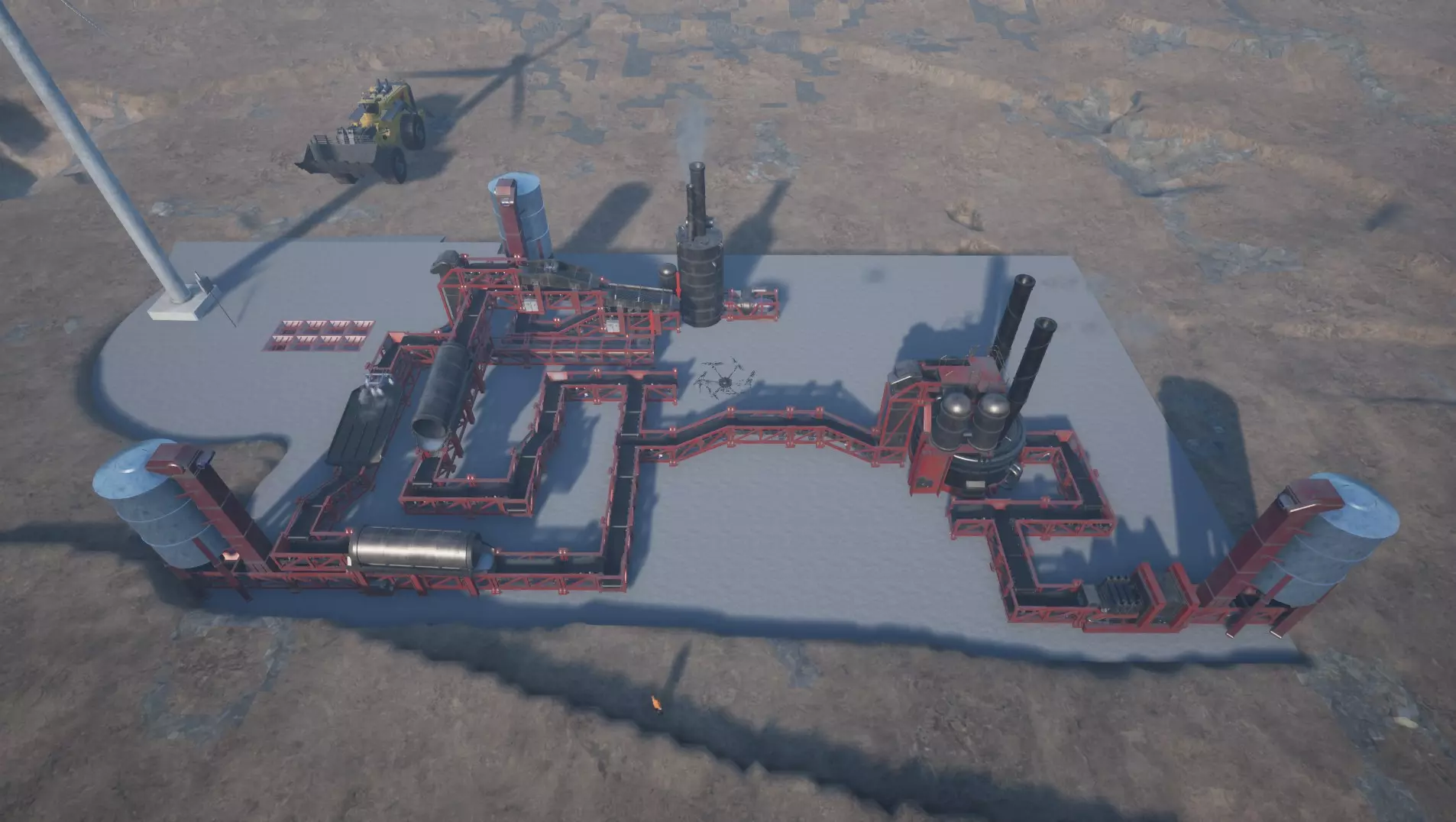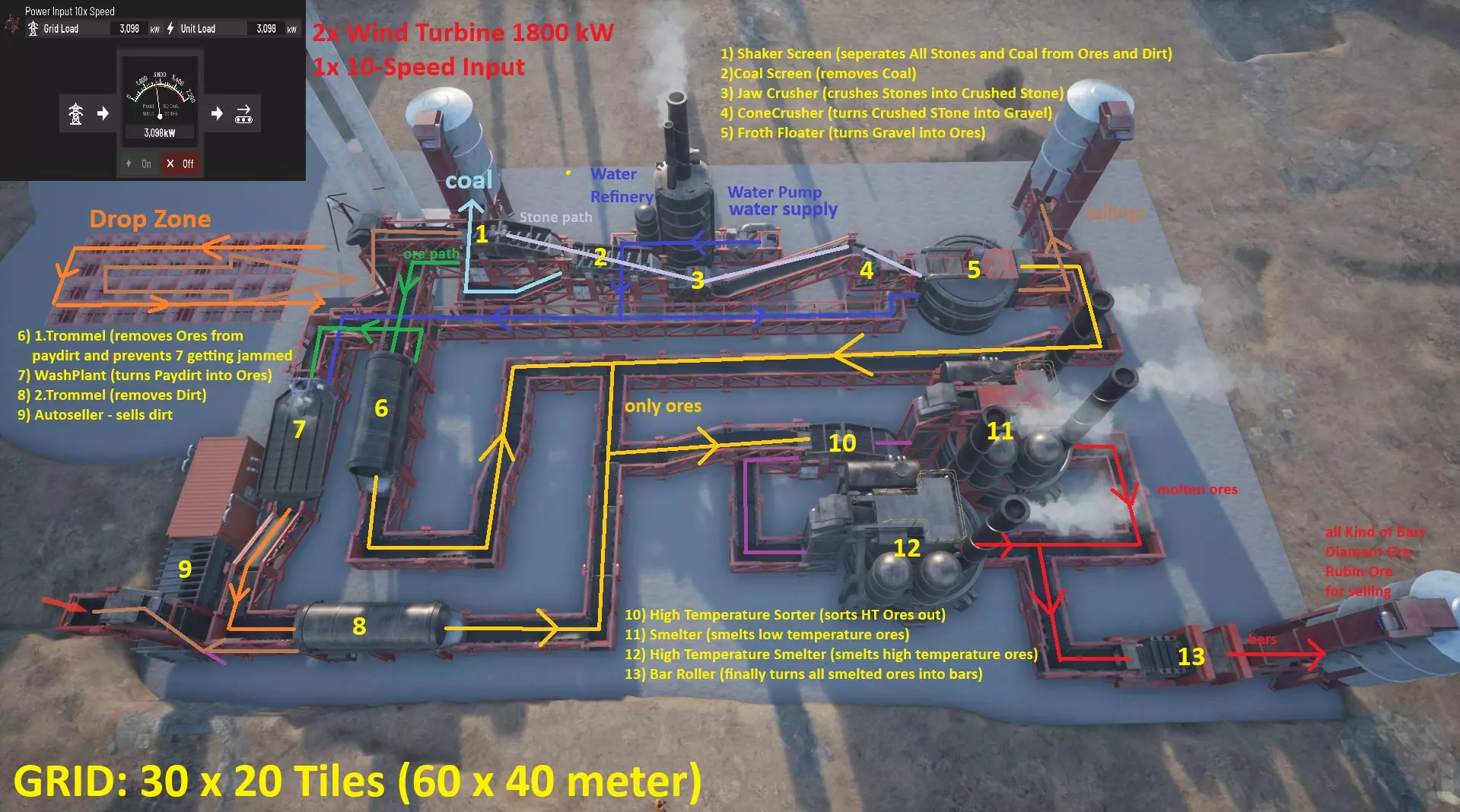 完整材料清单(包括包含8个不可见部件的倾倒区域) 产品 数量 单价(满级技能) 总价 单价(无技能) 总价 棒磨机 1 9,650.00美元 9,650.00美元 10,000.00美元 10,000.00美元 大料斗 4 4,343.00美元 17,372.00美元 4,500.00美元 18,000.00美元 溜槽 1 1,448.00美元 1,448.00美元 1,500.00美元 1,500.00美元 煤炭筛 1 7,238.00美元 7,238.00美元 7,500.00美元 7,500.00美元 圆锥破碎机 1 53,075.00美元 53,075.00美元 55,000.00美元 55,000.00美元 4x4下料管 3 4,343.00美元 13,029.00美元 4,500.00美元 13,500.00美元 倾倒平台 32 2,413.00美元 77,216.00美元 2,500.00美元 80,000.00美元 8米升降机 2 4,343.00美元 8,686.00美元 4,500.00美元 9,000.00美元 泡沫浮选机 1 7,238.00美元 7,238.00美元 7,500.00美元 7,500.00美元 高温熔炉 1 9,650.00美元 9,650.00美元 10,000.00美元 10,000.00美元 高温分选机 1 7,913.00美元 7,913.00美元 8,200.00美元 8,200.00美元 颚式破碎机 1 43,425.00美元 43,425.00美元 45,000.00美元 45000,00 左侧 2x13美元 4,343.00美元 56,459.00美元 4,500.00美元 58,500.00 合并器3美元 5,308.00美元 15,924.00美元 5,500.00美元 16,500.00 管道左侧 2米3美元 4,343.00美元 13,029.00美元 4,500.00美元 13,500.00 管道右侧 2米1美元 4,343.00美元 4,343.00美元 4,500.00美元 4,500.00 管道分流器1美元 5,308.00美元 5,308.00美元 5,500.00美元 5,500.00 直管2米2美元 1,448.00美元 2,896.00美元 1,500.00美元 3,000.00 直管4米1美元 2,413.00美元 2,413.00美元 2,500.00美元 2,500.00 直管8米4美元 4,343.00美元 17,372.00美元 4,500.00美元 18,000.00 电力电缆3美元 10.00美元 30.00美元 10.00美元 30.00 电力输入10倍速度1美元 120,625.00美元 120,625.00美元 125,000.00美元 125,000.00 电力塔5400千瓦1美元 11,580.00美元 11,580.00美元 12,000.00美元 12,000.00 右侧2x6美元 4,343.00美元 26,058.00美元 4,500.00美元 27,000.00 销售点1美元 12,545.00美元 12,545.00美元 13,000.00美元 13,000.00 振动筛1美元 7,238.00美元 7,238.00美元 7,500.00美元 7熔炉 1台 9,650.00美元 9,650.00美元 10,000.00美元 10,000.00美元 仓库 3台 6,273.00美元 18,819.00美元 6,500.00美元 19,500.00美元 直管道2米 1台 1,448.00美元 1,448.00美元 1,500.00美元 1,500.00美元 直管道4米 7台 2,413.00美元 16,891.00美元 2,500.00美元 17,500.00美元 直管道8米 2台 4,343.00美元 8,686.00美元 4,500.00美元 9,000.00美元 滚筒筛 2台 7,238.00美元 14,476.00美元 7,500.00美元 15,000.00美元 4x4向上管道 2台 4,343.00美元 8,686.00美元 4,500.00美元 9,000.00美元 8x6向上管道 2台 4,343.00美元 8,686.00美元 4,500.00美元 9,000.00美元 洗矿机 1台 7,238.00美元 7,238.00美元 7,500.00美元 7,500.00美元 水泵 1台 1,448.00美元 1,448.00美元 1,500.00美元 1,500.00美元 水精炼厂 1台 7,527.00美元 7,527.00美元 7,800.00美元 7,800.00美元 180型风力发电机 2台 109,431.00美元 218,862.00美元 113,400.00美元 226,800.00美元 总计(熟练工)874,177.00美元 总计(非熟练工)905美元830,00 部分临时布局(仅适用于矿砂和煤炭) 这是首个布局的最小化版本: (前期无需更多内容,因为此时你几乎只能获得泥土、矿砂、煤炭和较低等级的矿石) - 使用1倍速电力输入 - 不处理石头 - 不处理/熔炼高价值矿石(但会储存它们) - 不自动出售泥土(进行储存) - 此布局与上一个布局完全相同,只要你有资金就可以随时扩展(除了1倍速输入→10倍速输入外,不会用到之后需要的物品) 因此,它的成本低得多(不到一半价格)