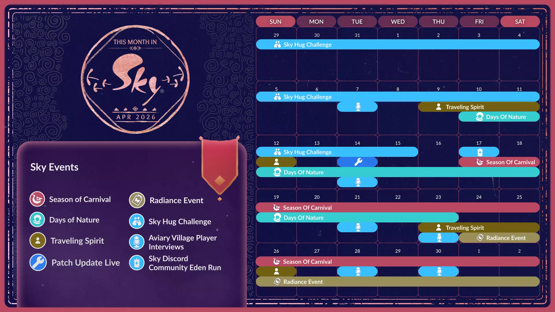 4月10日 - 23日 如同现实生活一般,助力我们的世界恢复是一项需要众人携手、持续进行的努力。 往年的活动将再度回归,同时还将推出一项新活动——你可以拾取海滩上遗留的废弃物品,将其打造成美丽的雕塑。完成这些雕塑需要社群共同努力,因此当你进入活动区域后,记得寻找感恩贝壳收集者以开启活动。 光遇创作者大奖 - 投稿已截止 2026年光遇创作者大奖的投稿现已截止! 感谢所有与我们分享创意的人,也感谢全球所有为朋友和喜爱的创作者加油鼓劲的光之子们。我们非常激动地将于5月1日与大家分享创作者大奖的提名名单!《光·遇》社区公告及活动信息 1. 关注我们的社交媒体渠道获取更新。 2. 光辉活动:黑黄之光 活动时间:4月24日 - 5月7日 3. 旅行先祖 出现时间:4月9日 - 12日;4月23日 - 26日 4. 社区公告 【天空拥抱挑战】 截止到4月15日,与世界分享拥抱!在社交媒体发布拥抱相关内容并使用指定标签参与挑战。 5. 游戏内舞台玩家访谈 整个4月,Tethys将重返游戏内舞台进行更多访谈!请在以下日期的PDT时间下午4:00,前往鸟舍舞台加入她和她的嘉宾: 4月7日 4月14日 4月21日 4月23日 4月28日 4月30日 社区伊甸之旅 4月17日,下午4:00 你猜对了!又到了社区伊甸之旅的时间!加入我们,一同在风暴中进行另一场充满乐趣的冒险。届时将启用庆典科技,部分工作人员也会直播他们的光之子穿越伊甸的过程。 Discord游戏活动 4月17日下午4:00 社区伊甸之旅 在自然日和狂欢季期间,社区开发人员将在Skycord舞台频道举办游戏活动。请关注服务器的活动选项卡,以获取最新添加的日期和时间安排!光·遇创作者计划特色 若你想了解更多关于我们的内容创作者计划,或想查看众多优秀的光·遇内容创作者,可访问我们的网页。