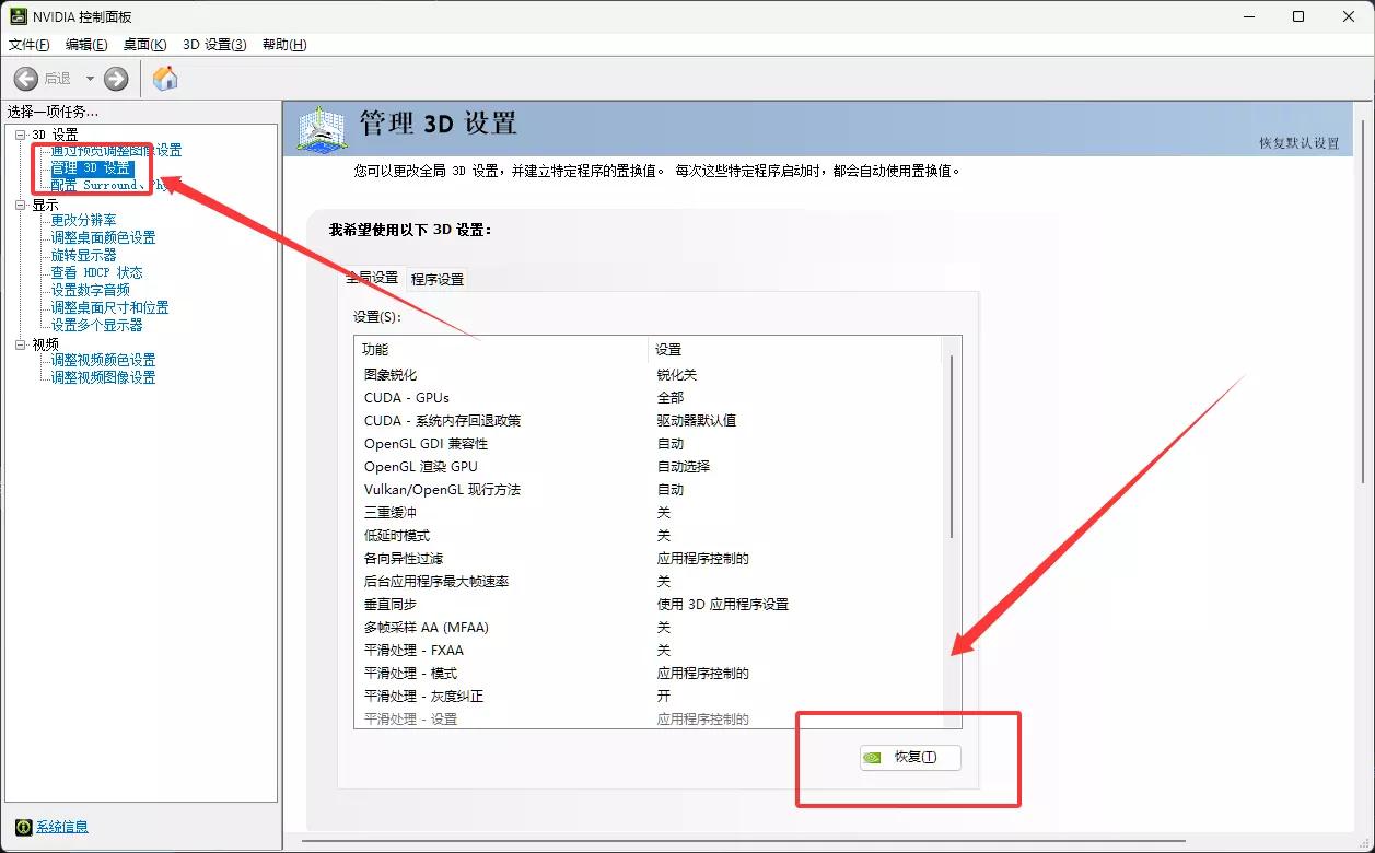 2.找到管理3D设置,并恢复原厂设置