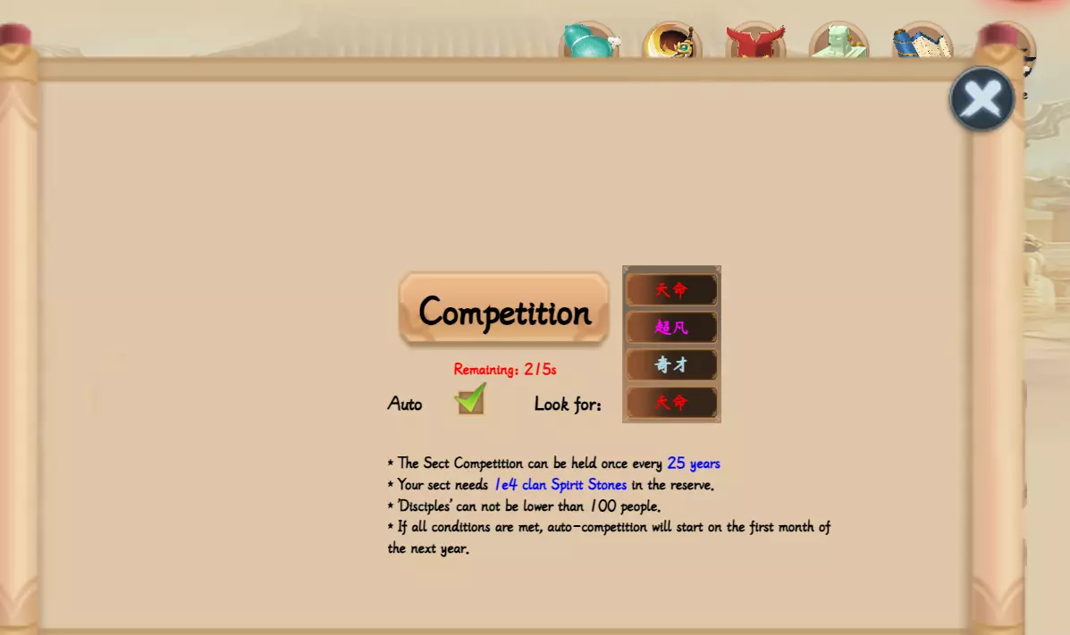 一旦你拥有了该灵兽的神圣形态,就可以将其放入宗门中进行少量升级,但不必过于在意。一旦它开始占用过多时间,就将其取出,不必再费心。 前往你的宗门,点击【阵法】,然后进入右下角的【灵兽阵】,点击【管理】。你应该有3个空位。点击【新灵兽】标签,将你的蛋放入。进行【献祭】,这样你就获得了一只灵兽。 现在,你需要返回宗门,点击【优先提升境界】。查看你的弟子标签,并按境界排序。留意境界最高的弟子。尝试让一名核心弟子尽可能突破到更高境界,直到再次遇到资源瓶颈。当你无法再让该弟子突破时,点击管理下方的停止。返回弟子标签页,等待核心弟子完成当前正在进行的任何事情,因为当他们无法突破时,默认会去获取资源。然后,点击他们并点击结果。此时应该会显示他们处于空闲状态。 宗门篇 第二部分 前往征服标签页。点击底部的【北方裂隙】。将该核心弟子放入那里的插槽中。如果你没有看到任何选项,说明他们要么仍在执行任务,要么你尚未确认他们已完成的任务。一旦将他们放入其中,就又是一个等待的过程。只需挂机一会儿,10-20分钟,等待他们带回晶石和兽石。数量其实并不重要,由于倍率低且概率小,你不会获得太多。实际上只值得在那里留一个弟子。