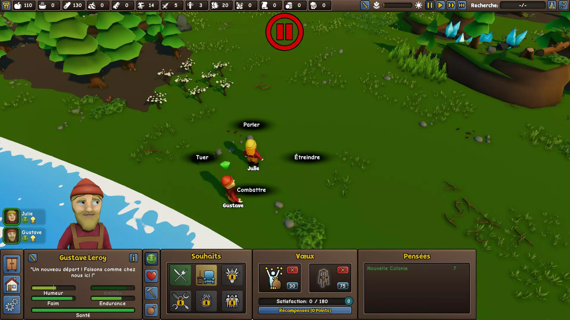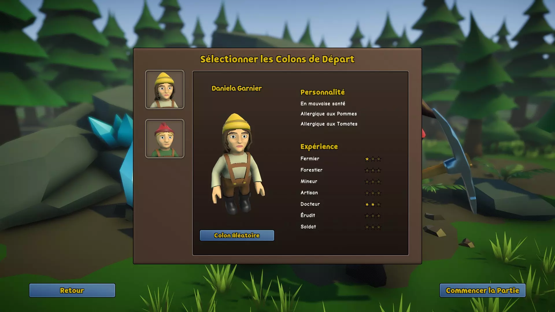 以下是一份帮助《Founders' Fortune》新手更好上手的小指南,让你能安心(或者说不一定)开启游戏。 殖民者的选择 这一步看似微不足道,实则非常重要。 首先,避开负面特质!有些负面特质影响不大,比如过敏或失眠,但如果你想顺利开局,有些特质则要避免:像悲观主义者、健康状况差、大胃王,尤其是白痴!虽然之后可以通过满意度点数消除所有这些负面特质,但这会花费太多时间,从而影响游戏初期的发展。 不过,有需要避免的负面特质,就有值得拥有的正面特质。【不知疲倦】特性可以让殖民者在睡觉时更快恢复耐力,从而有更多时间工作;而【乐观】特性能防止殖民者过快陷入抑郁,避免其在一段时间内变得失控(这很麻烦)。【学习迅速】看似不错,但通过研究解锁的图书馆能让一项职业快速提升到3星。 其次,你需要至少有一名拥有1星【医生】职业的殖民者!因为在初期,殖民者没有趁手的工具进行工作,经常会摔断胳膊或腿,有时甚至会让殖民者在好几分钟内无法行动和工作。他们也会生病,随着病情发展,健康值会逐渐下降,最终你必须让他们睡觉,以免死亡。总之,你必须拥有这位医生! 对于你的第二个殖民者,优先选择至少有一颗星的伐木工或农夫,这将是你开始发展殖民地时必须从事的两个职业。 最后,正如你可能已经理解的,尝试获得这些重要职业附带的重要加成,通过主动使用“随机殖民者”按钮,你的游戏初期将会更加轻松。