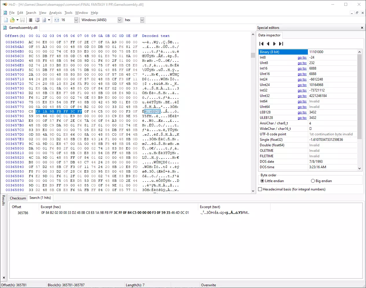 我找到了游戏中自动战斗标志的使用方式,有两段独立的代码会对其进行检测。一段代码控制战斗速度,另一段控制自动输入。通过仅修改控制战斗速度的代码,无论自动战斗标志是否设置,我们都能获得快速战斗。 请注意,每个像素重制版游戏的搜索值略有不同,因此我会为其他游戏添加单独的指南。 用十六进制编辑器编辑GameAssembly.dll(更新于2022年3月12日) 首先,用十六进制编辑器打开GameAssembly.dll。我使用的是HxD。 搜索十六进制值:E8 1A 9B FB FF 84 C0