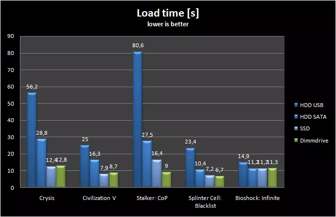 从图表中可以看出,在游戏加载速度方面,DimmDrive比硬盘(HDD)甚至固态硬盘(SSD)都要快。那为什么不直接使用硬盘或固态硬盘呢?