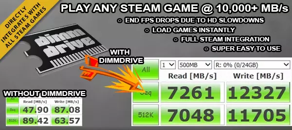 使用DimmDrive进行游戏 选择DimmDrive的理由有很多,但主要还是为了提升游戏体验。以下是传统硬盘(HDD)与DimmDrive的对比,你会发现DimmDrive的速度远超固态硬盘(SSD)。 DimmDrive就像是在你的电脑系统中虚拟出了一块固态硬盘,让你无需实际安装SSD就能享受到高速体验,同时还能避免使用5年以上后更换SSD的成本和麻烦。 传统硬盘(HDD)与DimmDrive对比 DimmDrive的优缺点!使用DimmDrive的优点: 游戏加载速度更快 游戏运行更出色、更流畅 可与其他应用程序配合使用 可用于Origin、Desura以及许多非Steam平台的游戏 无需购买其他固态硬盘和机械硬盘,为你节省开支 使用简单易懂 如果你的内存不足以运行特定游戏,可以使用【低内存】选项,该选项允许你选择想要更快加载的内容 使用DimmDrive的缺点: 没有缺点,它能为你省钱,你不再需要为游戏购买昂贵的固态硬盘,它会使用你已有的系统内存! 总结 这绝对是电脑玩家提升游戏体验的最佳软件。它能为你在购买新的游戏固态硬盘和机械硬盘上节省大量开支。我向所有玩家强烈推荐这款软件,它一直在不断改进,开发者也很重视社区的反馈意见。