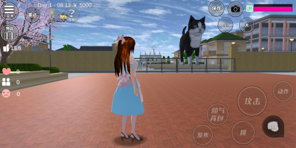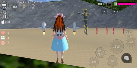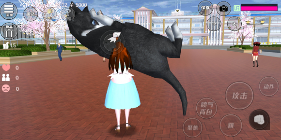 后来我发现了主角团(主要是猫管家),用猫管家射了好久发现对巨人来说伤害还是太低了。然后我就谋划了最成功的一局,把男生和猫管家都带来学校变大,然后引ufo过来打他们,让他们帮我打。