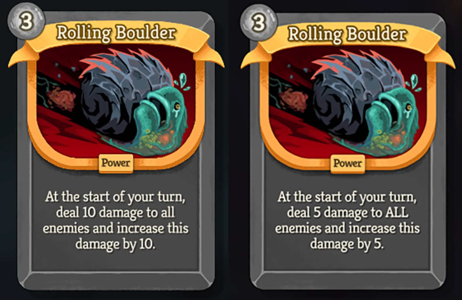 滚石:3费。你的回合开始时,对所有敌人造成10点伤害,然后将该伤害增加10点。