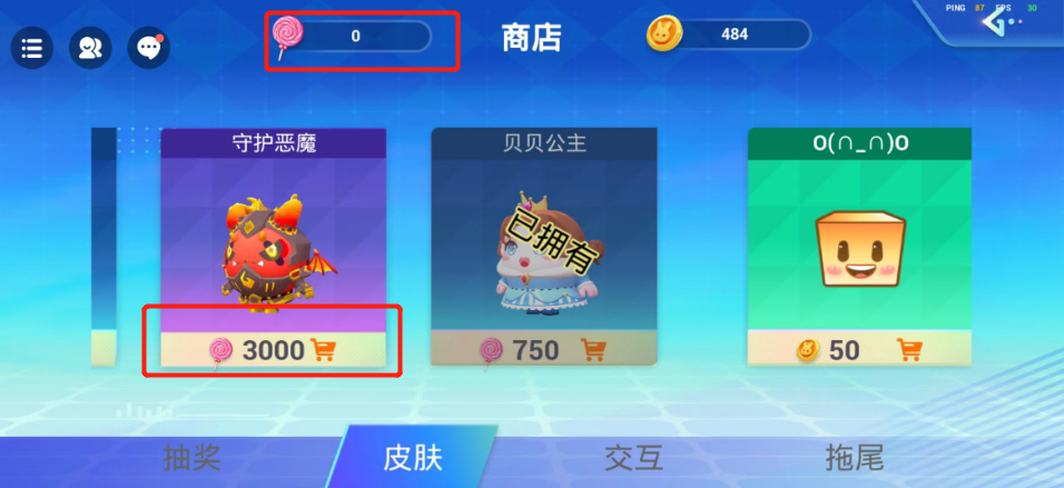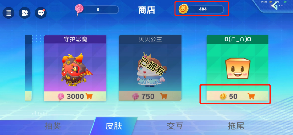💰💰商店中可以购买各种皮肤,交互动作和拖尾,还有抽奖,每天都会有一次免费抽奖的机会,大家记得要去抽奖哦!