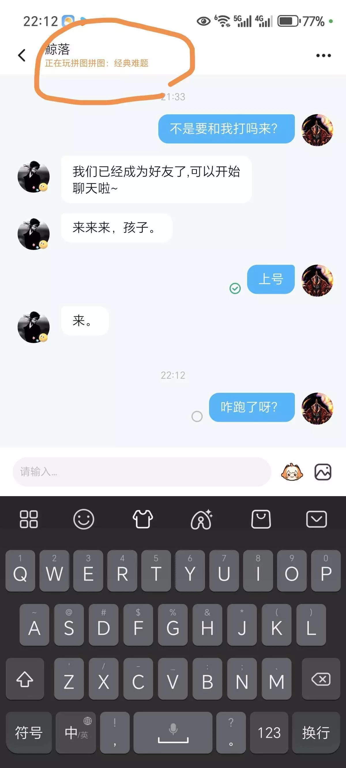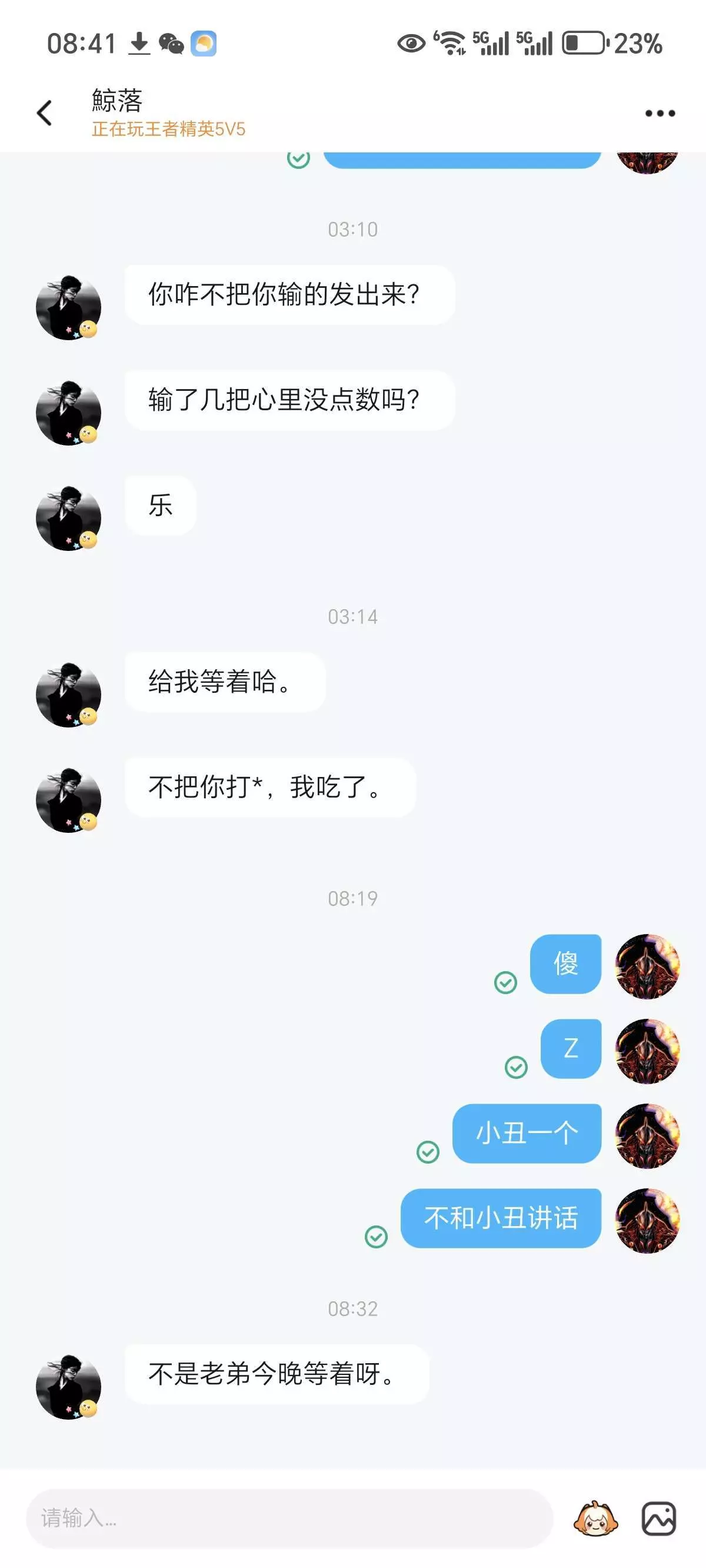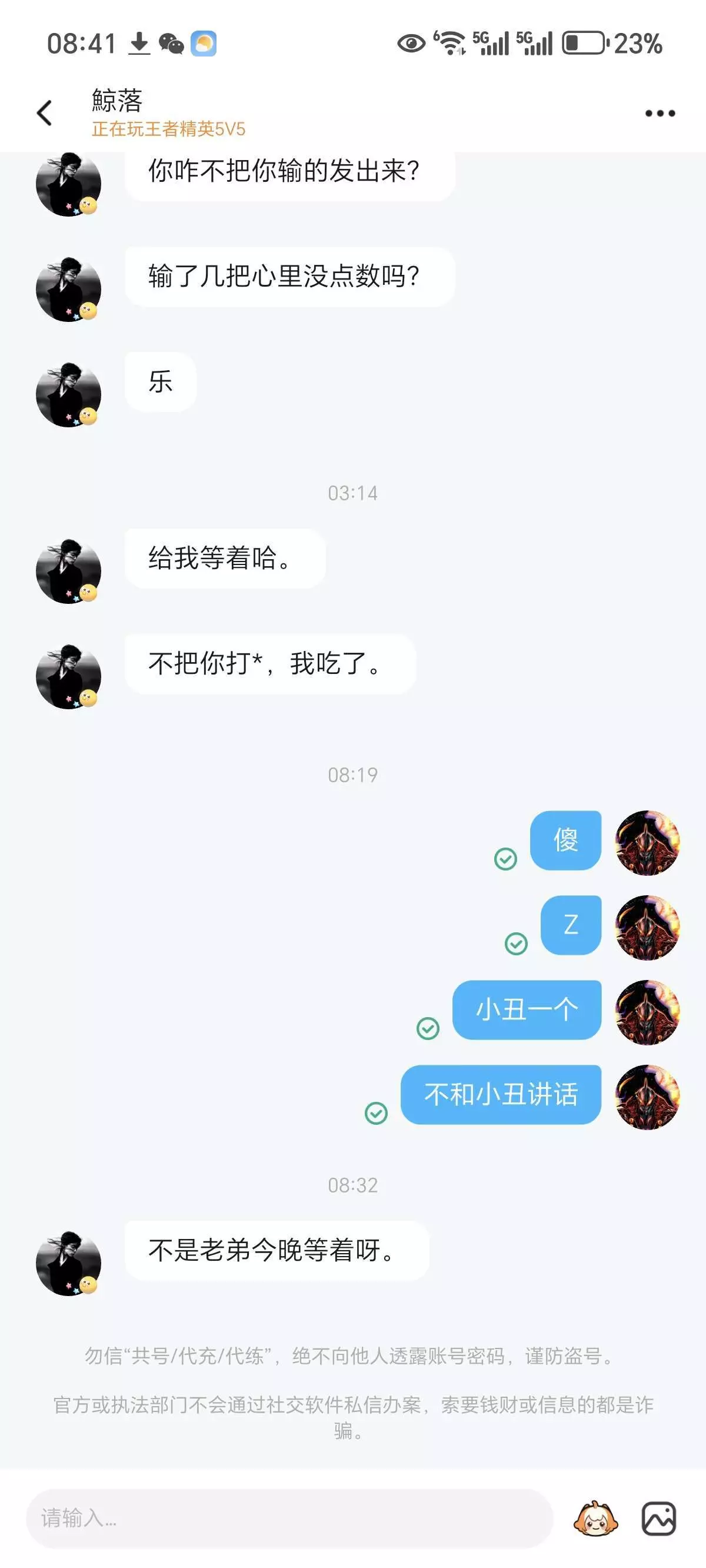 1v1打不过,然后5v五前面飘了,输了几把他还叫上了,感觉没赢过一样,一直说我输了很多吧,麻烦你讲证据,我就敢讲证据,我发的就是证据,这位小丑倒是发我那几把输的呀,天天叫我等着,给我等着,我也是笑了浪费本大王的时间
