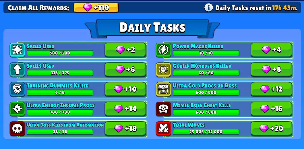 《放置英雄塔防》终极宝石 farming 指南 游戏中能获取多少宝石? 本指南介绍什么? 大家好! 我们都想知道在游戏中能 farming 多少宝石或“付费”货币,所以我整理了一份清单,来展示你在游戏中实际能 farming 的数量,结果非常可观! 这里会有两份清单,分别针对免费玩家和购买了礼包/ premium 的玩家。 礼包和 premium 如何影响宝石获取? 主要是你可以购买的永久 battlepass 升级,在达到可重复关卡后能提供大量宝石。 本指南不包含什么…… 本指南不会解释宝石的用途或花费地点。 本指南如何计算宝石收益? 由于 battlepass 每月重置,且是较大的宝石收入来源之一,所以我们将按每月来计算宝石数量。假设: * 每月按4周计算 * 每月按30天计算 由于此处我们衡量的是后期/终局阶段,因此不会将成就宝石计算在内,因为它们同样不可重复获取。 每日任务宝石 在任务 > 每日任务中,你可以看到10个每日任务,完成后每日可获得总计110宝石的奖励。