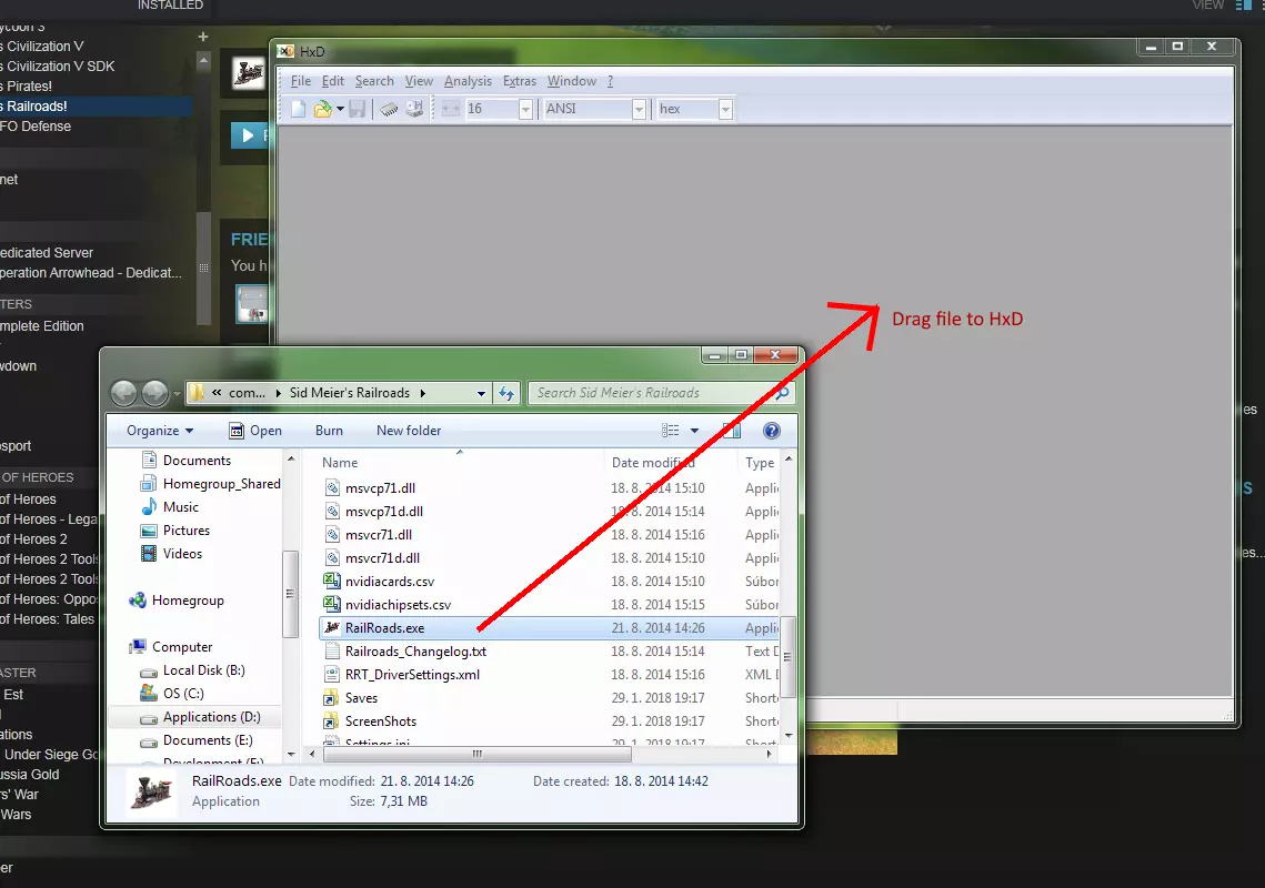 在打开的目录中找到游戏可执行文件,并用十六进制编辑器打开:将RailRoads.exe文件拖到HxD或你的十六进制编辑器中。 注意:如果禁用了文件扩展名,你将只能看到“RailRoads”,而不是“RailRoads.exe”。