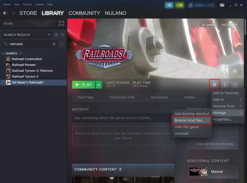 现在你需要导航至《席德·梅尔的铁路》的安装目录:在Steam中选择该游戏,点击右侧的齿轮图标,然后选择管理 > 浏览本地文件。