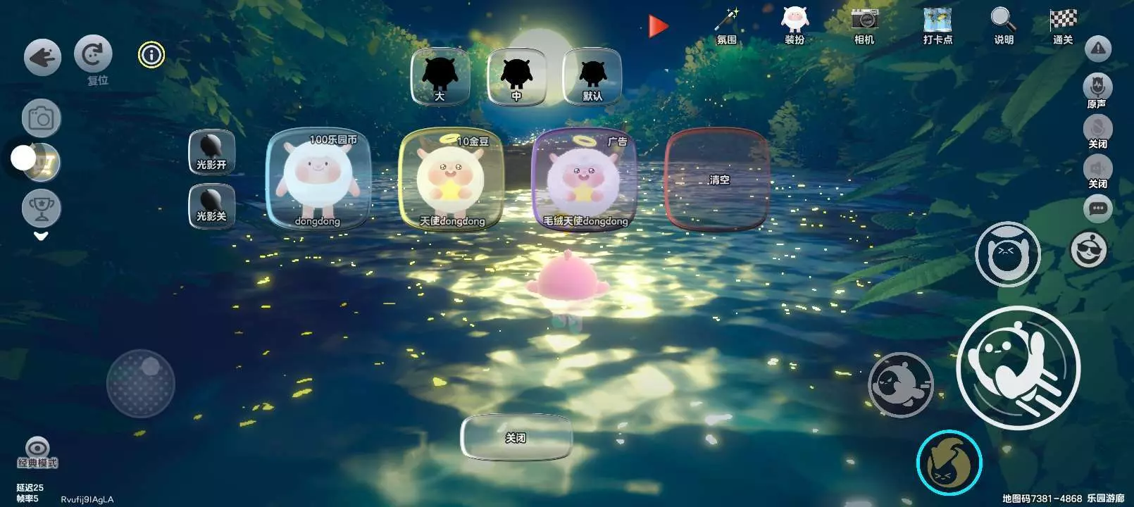 可以调节蛋仔的大小,阴影,氛围和视角,可以选择位置,右上角是终点