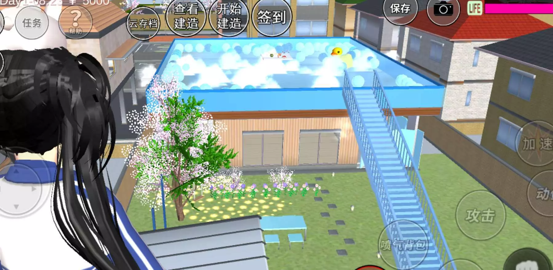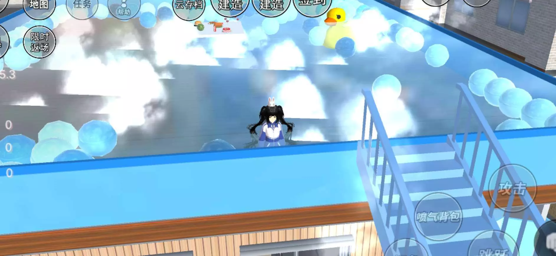 自己建的露天游泳池。整体是蓝色,建在男主家房顶上。因为我不经常建过什么跑酷、建筑之类的,所以建了一个简单的。建了之后开心好久。(不喜勿喷!!!)