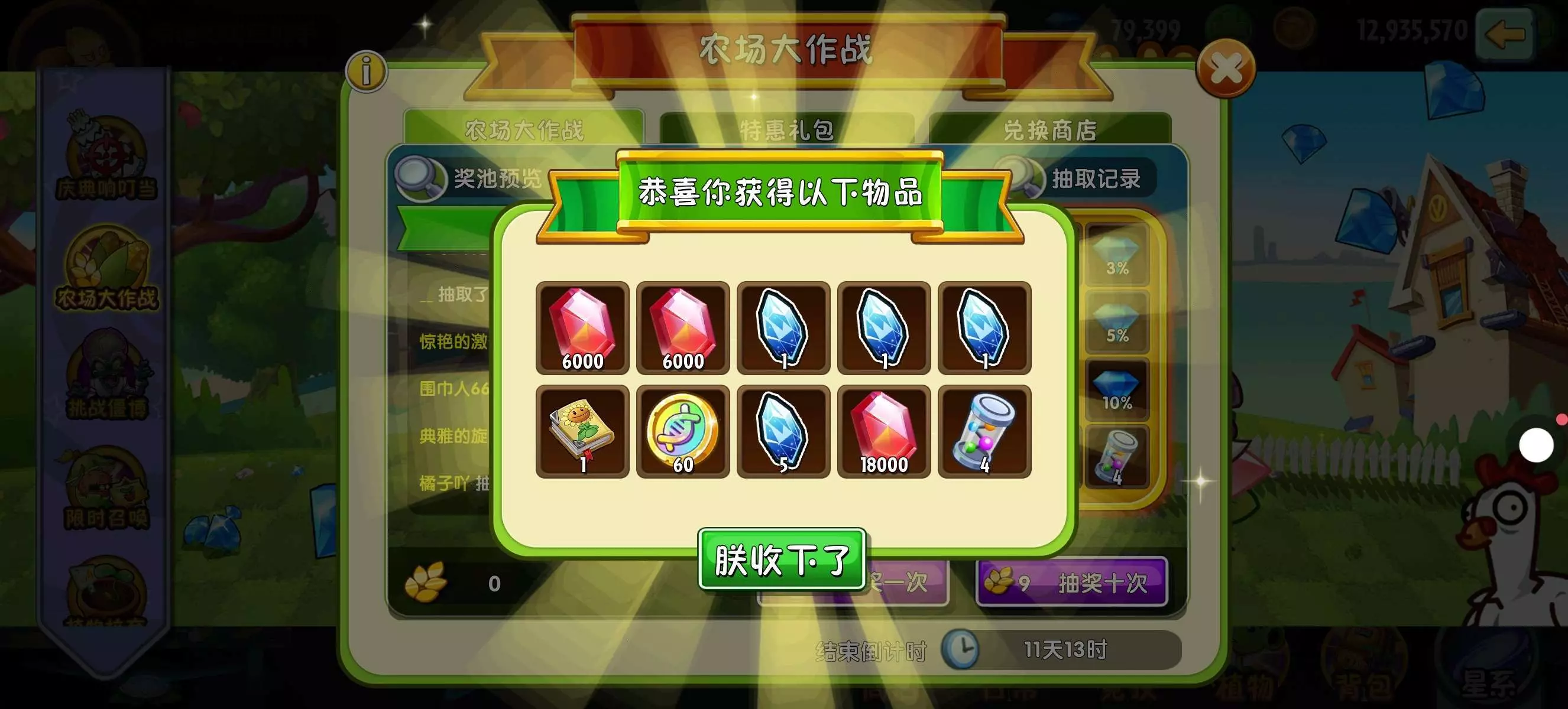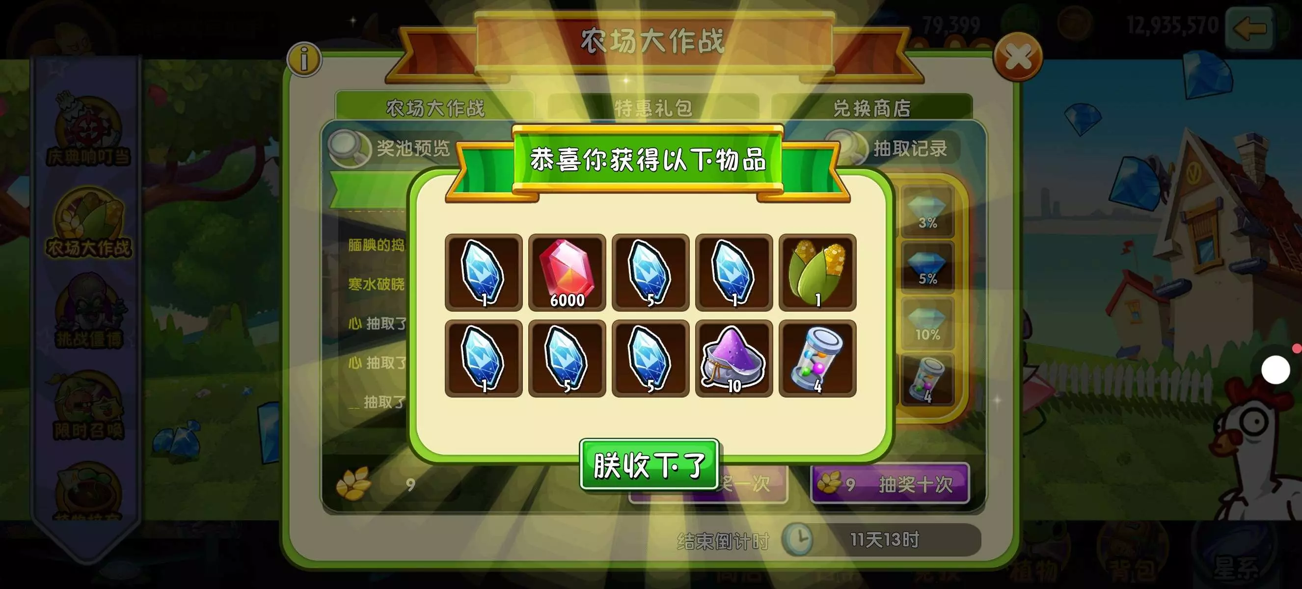 一个45+68,得到一本进阶书,20片万能碎片,6939钻石和一个超级玉米!!!