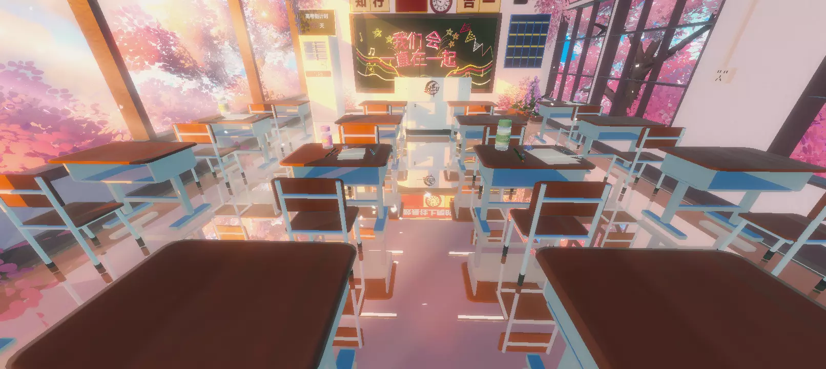 踏入这间教室,仿佛闯入了青春与梦幻交织的时空胶囊。整齐排列的课桌椅,静静等待着青春身影的落座,就像我们曾经无数次期待着新一天的课堂。黑板上 “我们会一直在一起” 的字样,带着青涩的誓言感,是年少时对友谊、对青春羁绊最美好的期许。窗外粉紫交融的光影,模糊了现实与幻想的边界,让我想起那些在教室窗边,望着晚霞憧憬未来的课间,温暖又带着淡淡怅惘,仿佛青春从未走远,只是换了种方式出现。