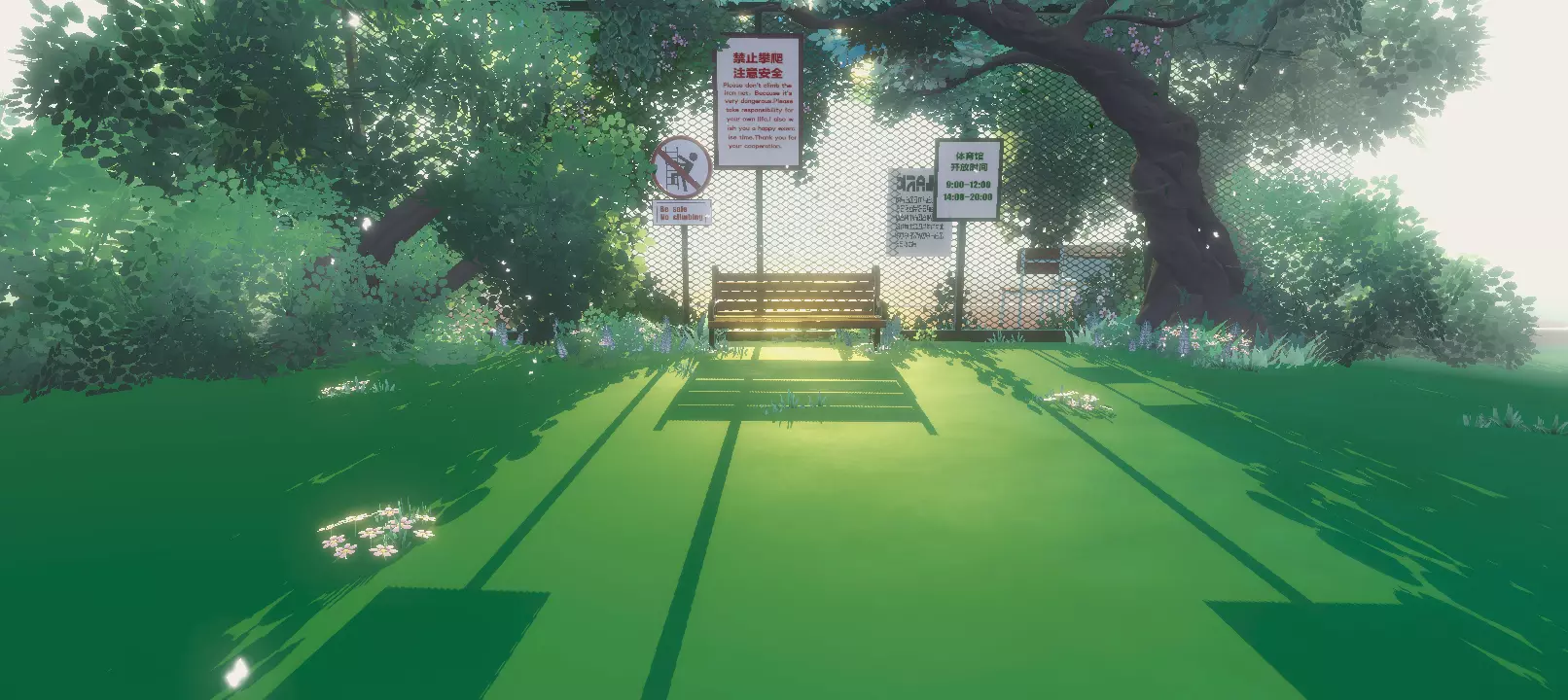 从教室的梦幻氛围走出,转角遇见这片绿意包裹的角落,像走进了青春里那些独处又安心的瞬间。斑驳树影洒在草坪,长椅静立在围栏旁, “禁止攀爬 注意安全” 的告示牌,带着学校特有的、既想约束又满是关怀的气息。周围小花点缀,绿植轻晃,阳光透过枝叶漏下,营造出一种温柔的静谧。这让我想到课间偶尔逃离喧闹,找个安静地方发发呆的时刻,什么都不想,只是被这自然又亲切的校园角落治愈,把烦恼暂时锁在围栏外 。