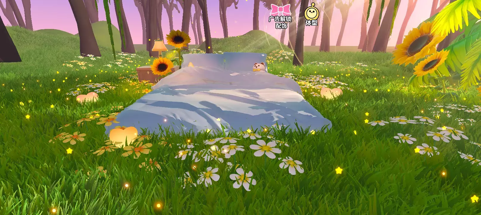 在一片被温柔暮色笼罩的森林草地间,一张床悄然安卧。浅蓝床品如云朵轻覆,枕畔还卧着只憨态可掬的小玩偶,像是在守护这方静谧。床侧的小桌上,台灯散发暖黄光晕,与向日葵明艳的金黄交织,给画面添了几分温馨。