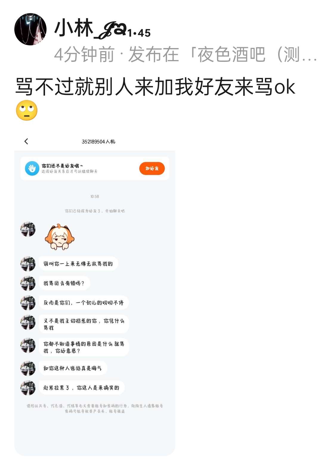 笑了,颠倒黑白说是我先惹的他还说是我先加他好友骂的 也不知道到底是谁当时加别人好友 ,我有证据