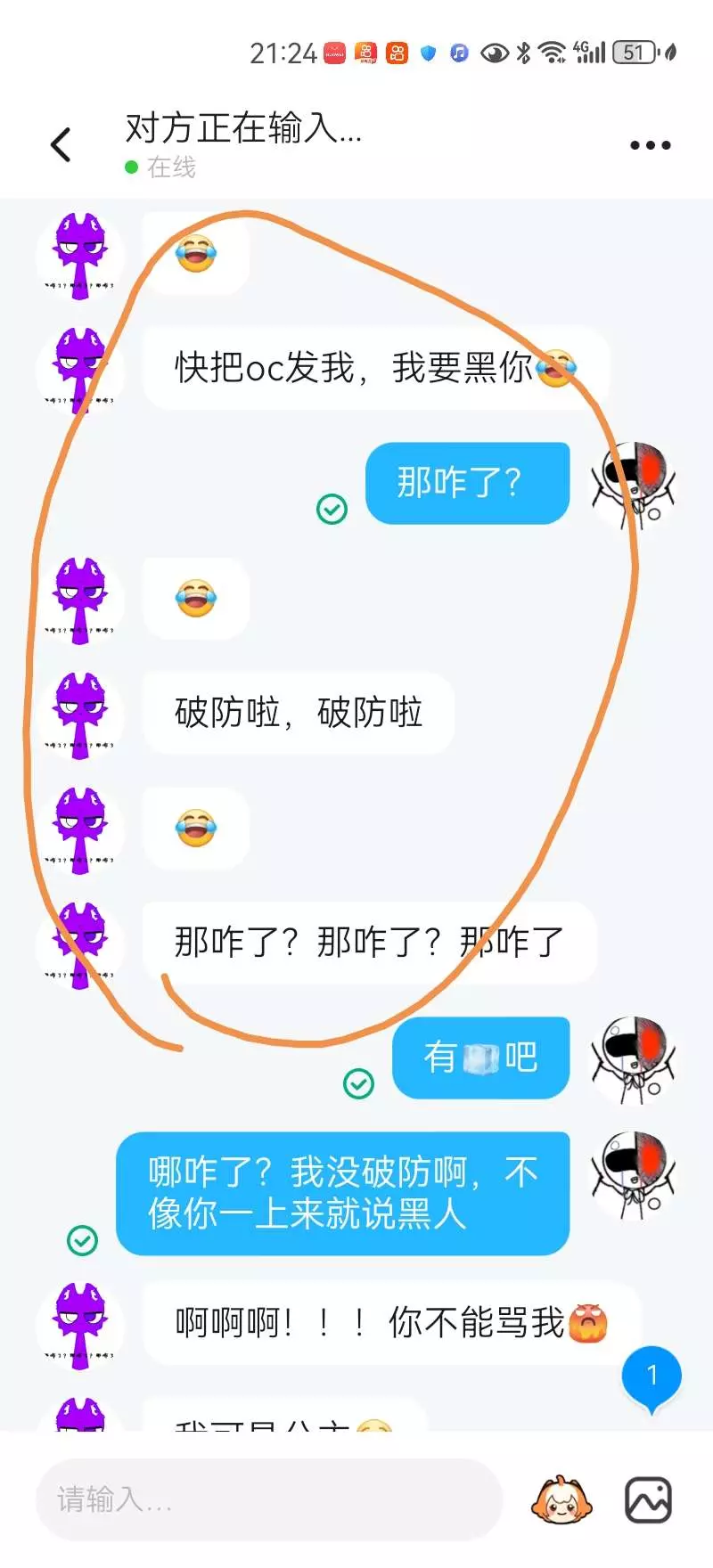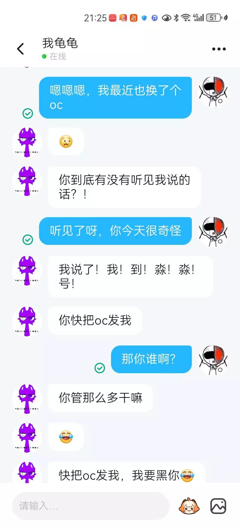 还说让我把oc发过来,请看图片,他还说自己是公主,直接回怼他,没有公主命,一身公主病,我无语了,他就是这样,盗的头像都变了,我觉得他怎么有点奇怪?
