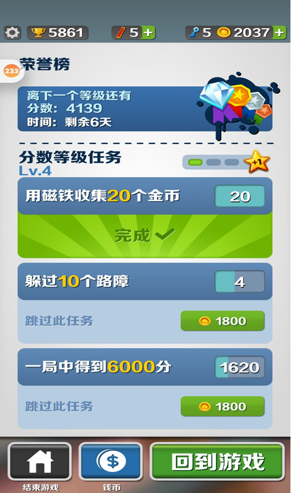 这里还有需要注意的点,一局跑酷下来,可以完成的任务数是不受限制的,那么当我们完成三个任务加了倍数之后如何知道我们后面的任务信息呢?只要点下左上角的等号就可以看到我们后面的任务了。