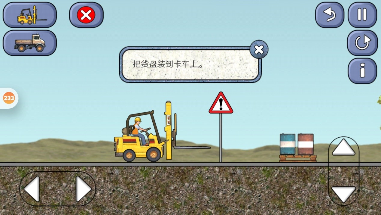 注意,注意,注意!重要的事情说三遍,一定要先把卡车开过凸面,叉车再把物品放进卡车,不然一过凸,卡车上的物品就会掉下来。