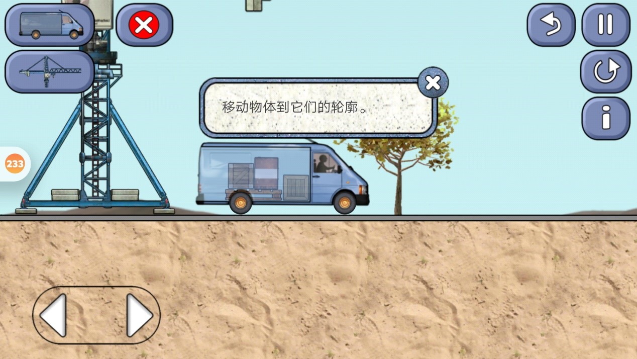这一关,先让货车往左边走,一下子加速,利用惯性让车里的物体都掉出来,然后再利用起吊机把物品放到轮廓上就可以通关。