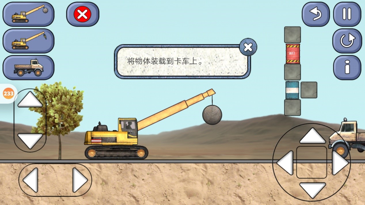 先用左边吊机圆球把红色油桶上面的石头砸掉,再用右边的吊车把红色油桶放卡车上。然后再把中间的石头砸掉,再把油桶放卡车里,把吊车删掉就行了