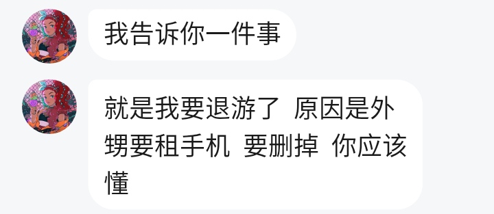 跟大家说件事。就是…………我的朋友退游了。我很伤心😭。以后没人陪我聊天了。没人陪我玩游戏了。想起那年那月那日,他们陪我玩游戏的时候,我是多么开心,多么希望……我们一直开心,可是到了今天,他们…………退游了。所以我很伤心。谁能安慰一下我?