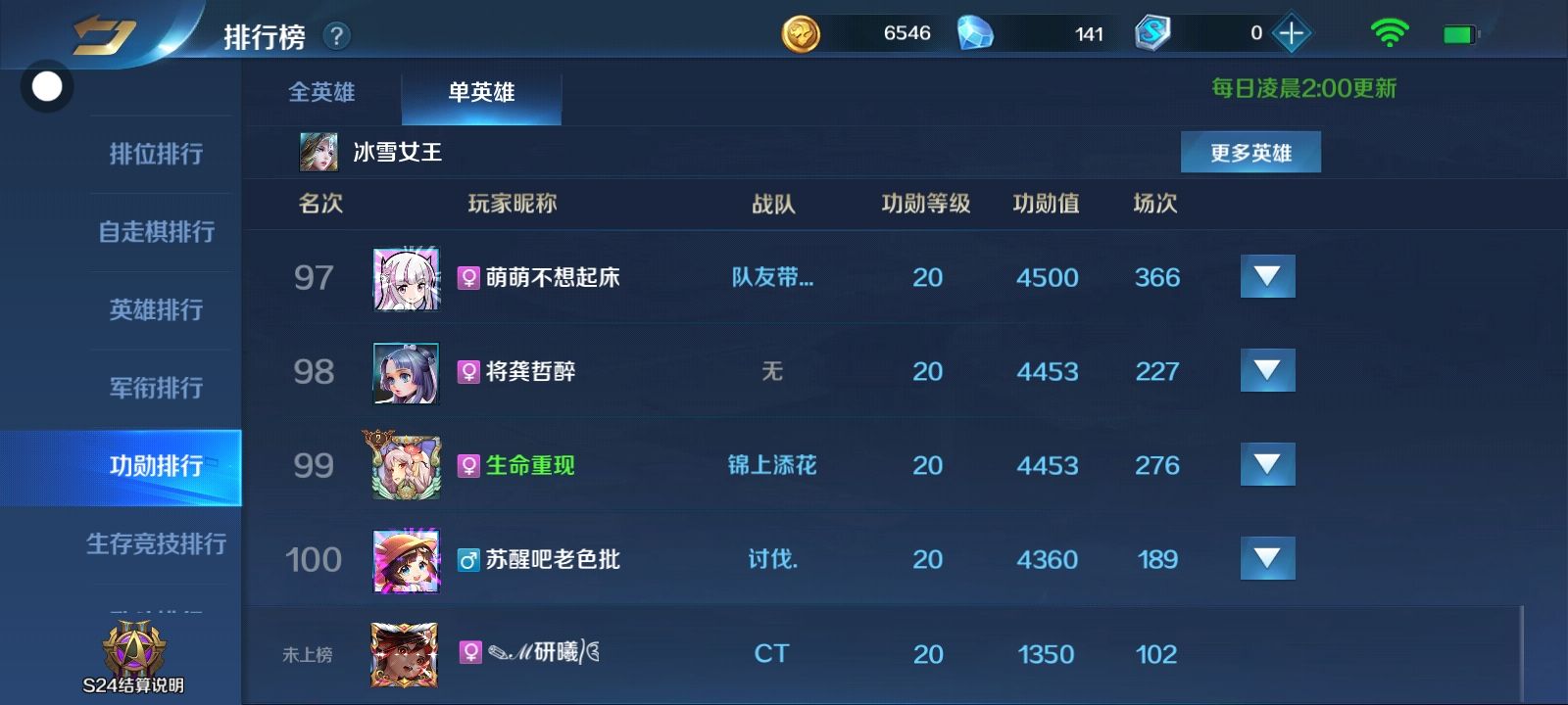 单英雄冰雪女王离100名相差3010功勋值,好难冲上去啊......